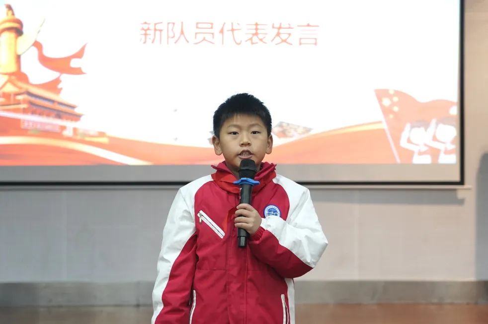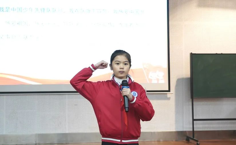 活动第三项,大队长杨雅琳同学带领所有的新队员进行宣誓:我是中国少年先锋队队员,我在队旗下宣誓,我热爱中国共产党,热爱祖国,热爱人民,好好学习,准备着,为共产主义事业贡献力量!在队旗下,新一批少先队员们庄严宣誓,郑重承诺,在今天成为建设社会主义的小小接班人。
