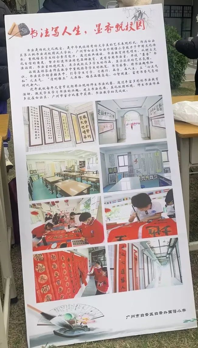 艺术节期间,通过积极申报,我校被评为广州市白云区中小学校第二批“书法进校园试点校”,孟祥芬老师组织学生参加2023年广州市白云区中小学校“书法进校园”成果展示活动,二1班赵淇雅,四2班林思齐书法作品在活动中被推选优秀书法作品展示,六2班廖学文接受电视台采访。