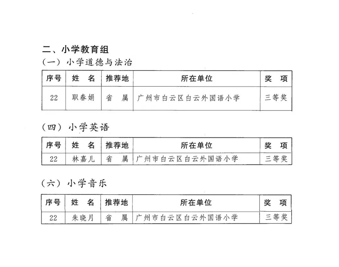 第四届广东省中小学青年教师教学能力大赛自启动以来,历经初赛、决赛、总决赛,有1300位教师在决赛中获奖,其中我校职春娟、林嘉儿、朱晓月老师分别获小学道德与法治组、小学英语组及小学音乐组决赛三等奖。