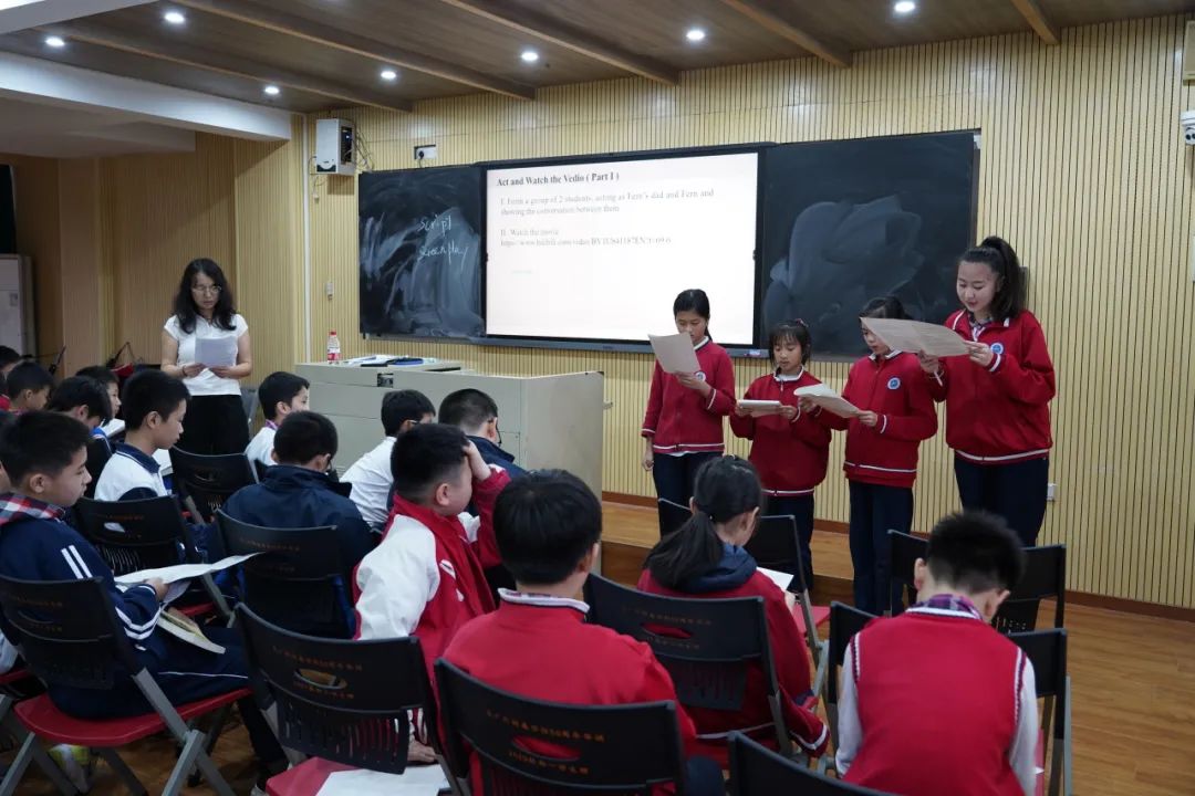 蔡欢副校长通过学生听读、用AI技术创建剧本、学生小组戏剧表演、围绕文本提问等多种方式,把孩子们带到了“网“的世界。