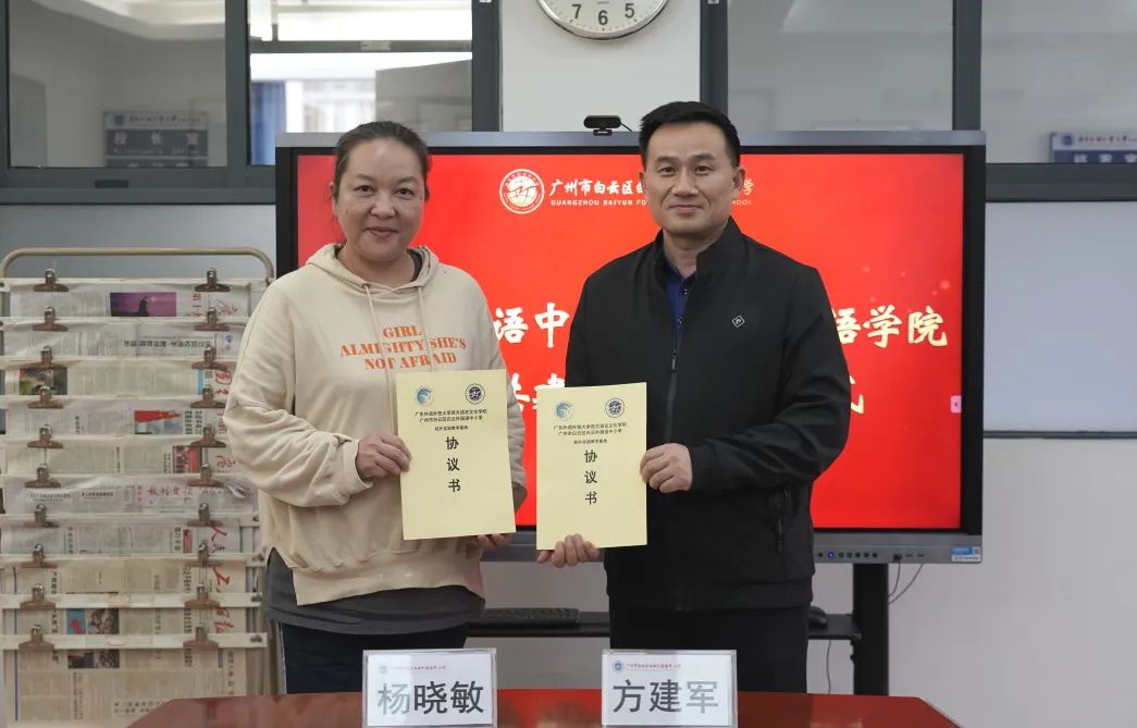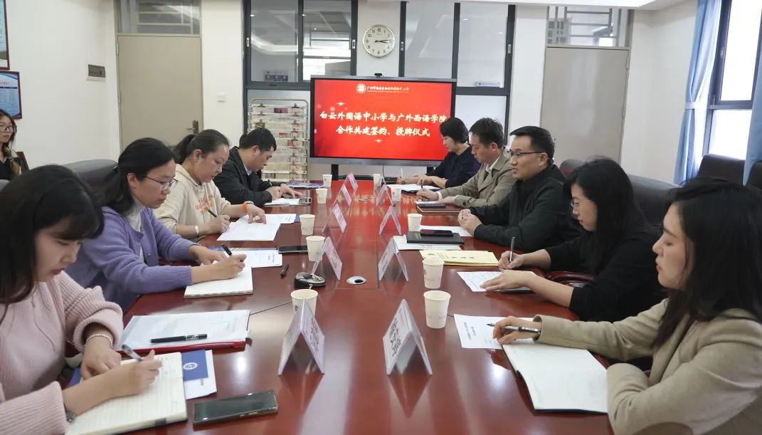 为深化高等教育与基础教育联合育人,加快建设高质量教育体系,培养高素质教师队伍。2024年3月15日下午,白云外国语中小学与广东外语外贸大学西方语言文化学院在学校第一会议室签署友好合作共建协议。参加会议的有:广东外语外贸大学西方语言文化学院院长杨晓敏、副院长陈星、党委副书记魏少娟、辅导员冯迪南、学院团委实践部负责人李睿及8位西语学院教员;白云外国语中小学党支部书记兼校长方建军、党支部副书记朱传兵、教师发展中心主任杨波、小学英语科组长喻安婷等。会议由我校校办陈丽丽副主任主持。