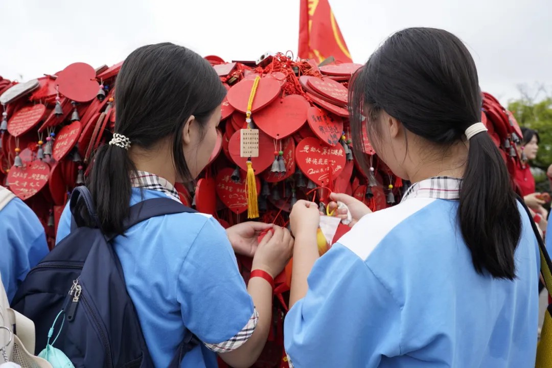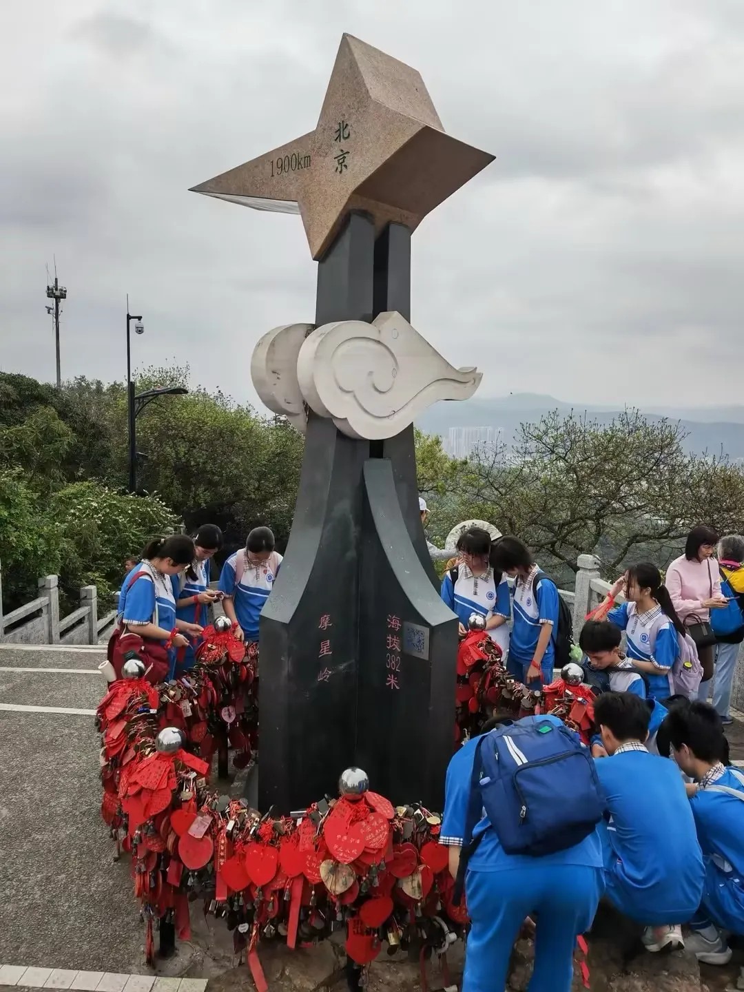 历经了两个多小时的爬坡与休整,大部队成功登顶摩星岭。同学们拿出自己精心准备好的心愿牌,有序地挂在许愿台上,充满了仪式感。