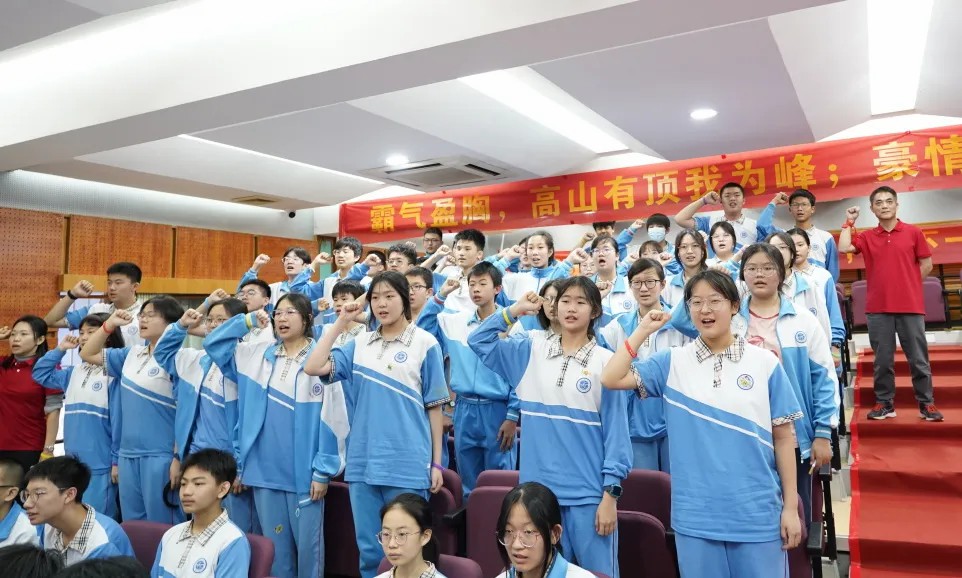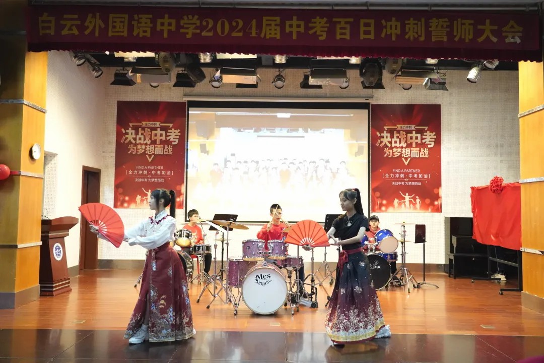 穿越成功门,走进温馨的云山礼堂,首先初一年级同学们带来激情澎湃的《龙》暖场表演,主持人庄严地宣布“白云外国语中学迎中考百日誓师大会”开始。