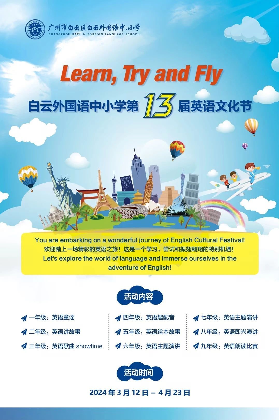 践行英语学习活动观,培养学生核心素养,实现立德树人的教育目标。我校在“Learning by Doing”活动育人的传统理念氛围中,成功举办了第13届英语文化节活动。本次活动以“Learn, Try and Fly”为主题,鼓励学生积极尝试,不惧挑战,展翅飞翔。一至九年级均举办了精彩纷呈的英语活动。