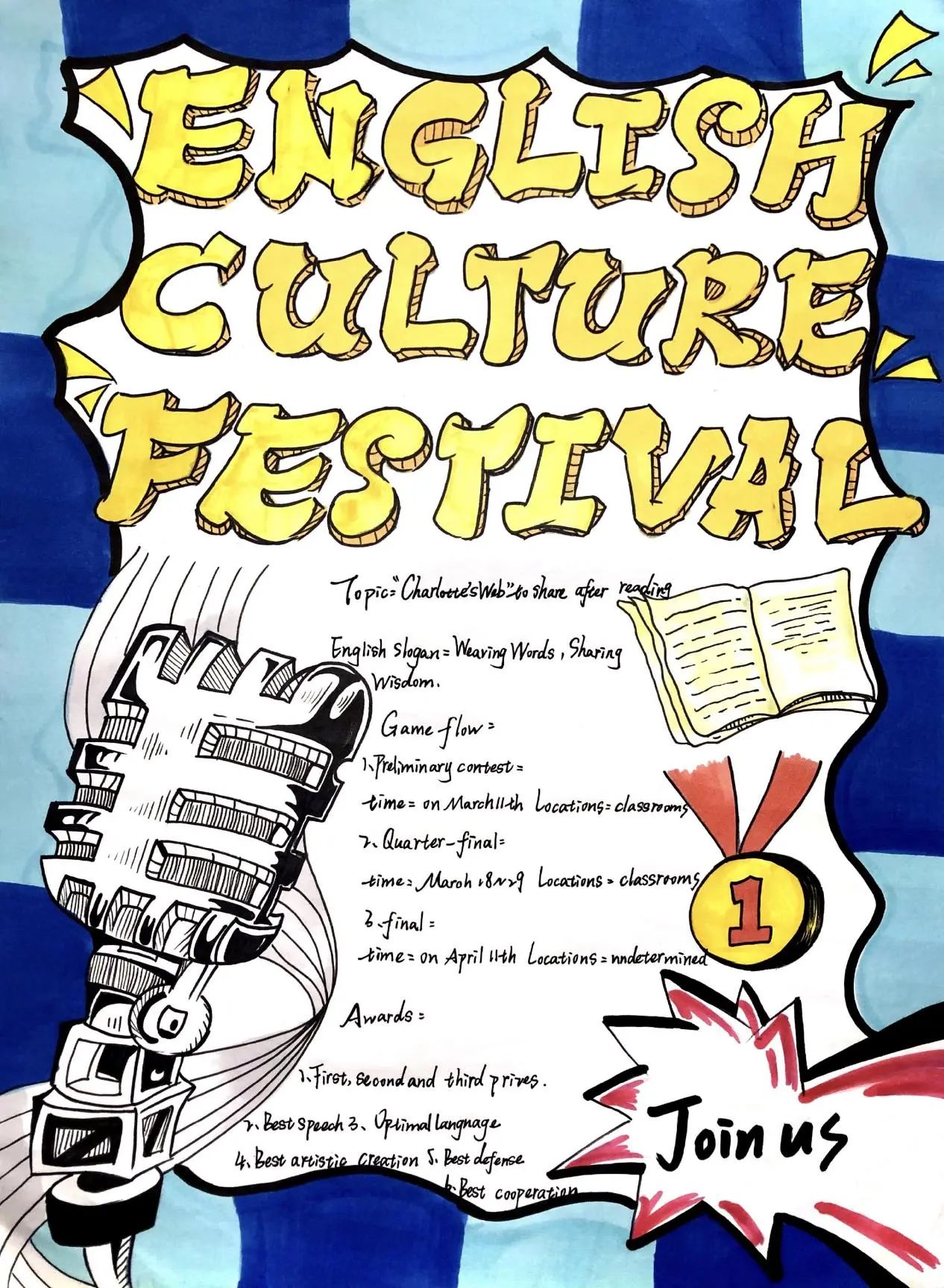 个人奖项方面,朱沛欣、苏鹏羽等共10位同学荣获“最佳语音语调奖”,黄小翔、马义云等共10名同学获得“最具活力奖”,黄初庭、闫馨文等共7名同学凭借其出色的舞台表现获得了“最佳台风奖”。团体奖项方面,初三4班、初三3班等班级分获特等奖和一等奖,初三2班、初三1班获得二等奖。(具体获奖名单如下)