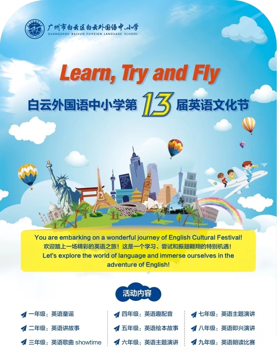 我校积极准备“广外杯”中小学英语能力大赛。三月伊始,我校中小学英语科组便齐心协力,借本校第13届英语文化节系列活动的契机,鼓励全员参与文化节活动,实现活动与人的教育理念,并为“广外杯”比赛储备选手。