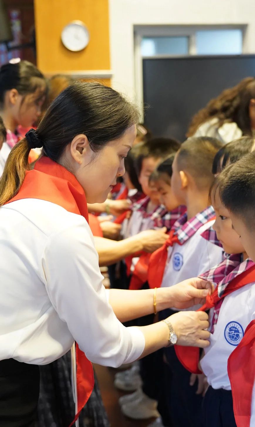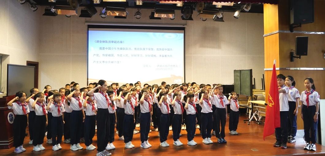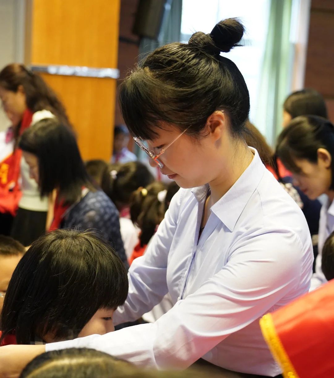 大队辅导员朱晓月老师宣读了新队员的名单。在师生的共同见证下,校领导和老师们为新队员戴上了鲜艳的红领巾。新队员个个精神饱满、神情庄重,满怀着对中国少年先锋队的期待和向往。从此刻起,他们便有了新的称号——少先队员;他们也有了新的组织——中国少年先锋队。