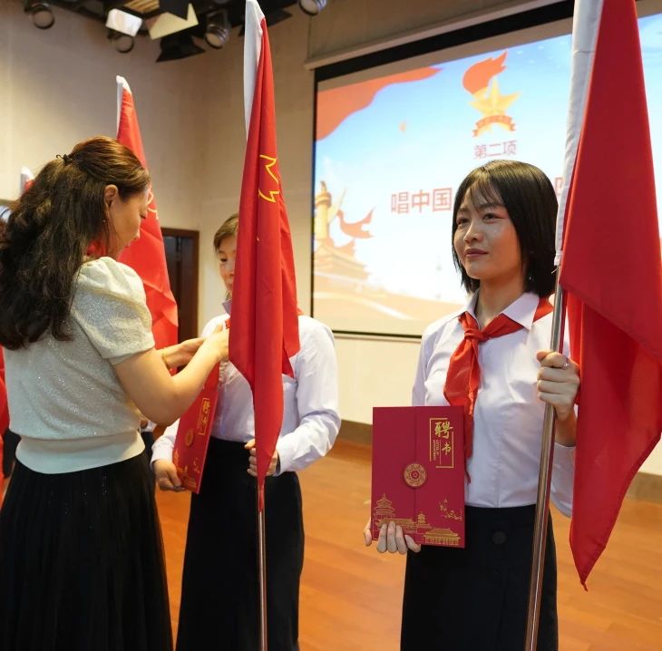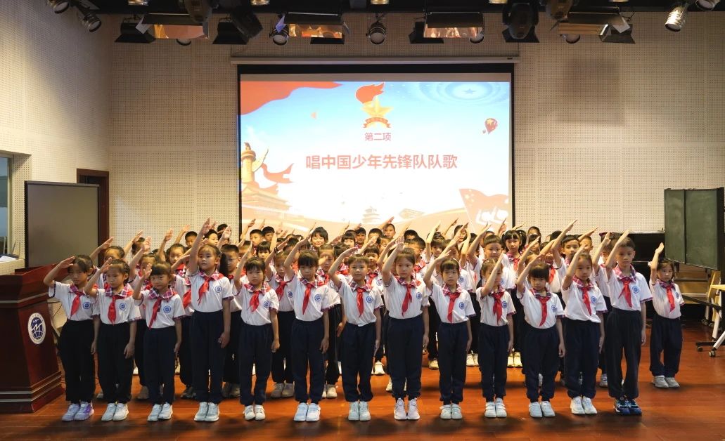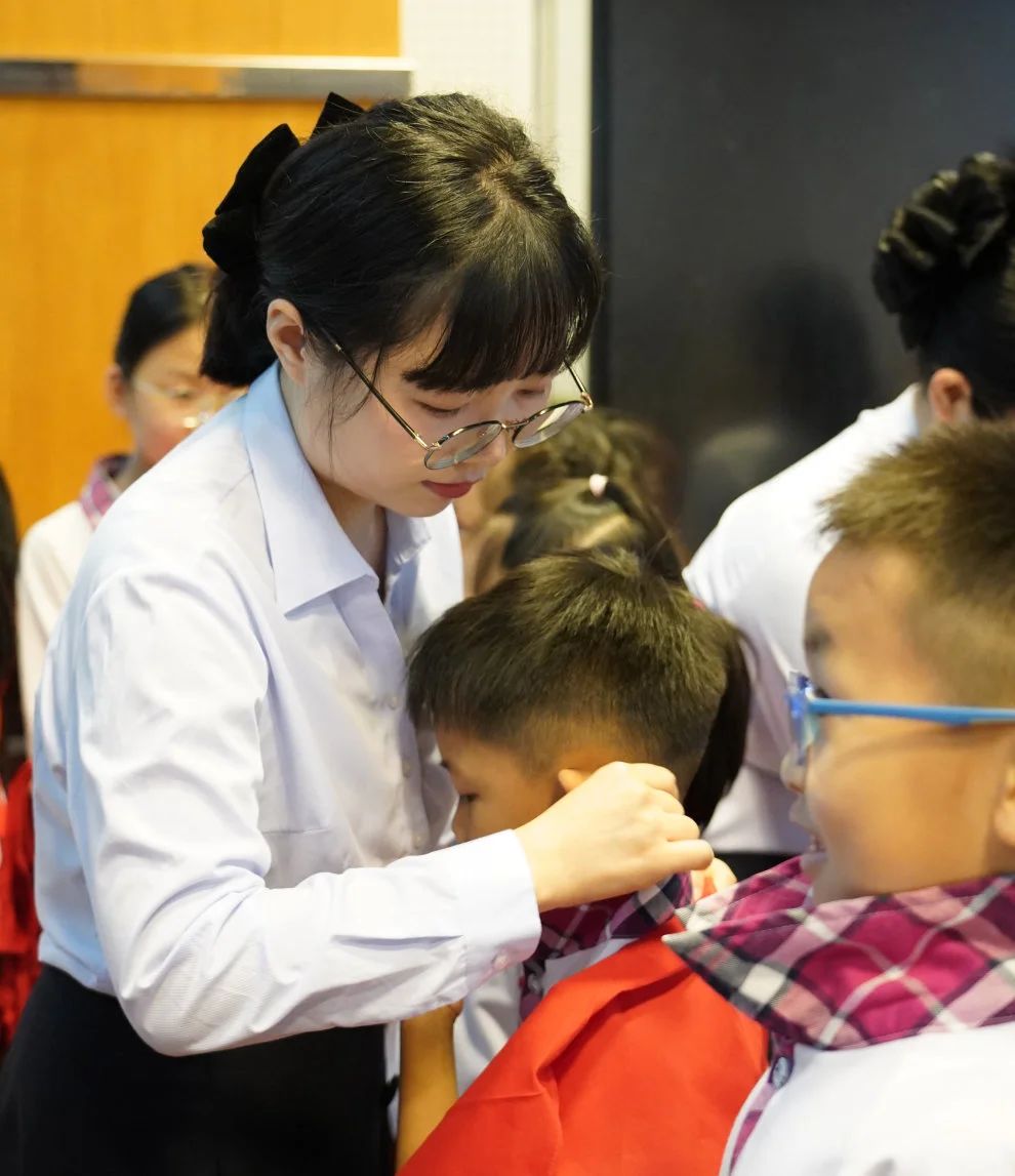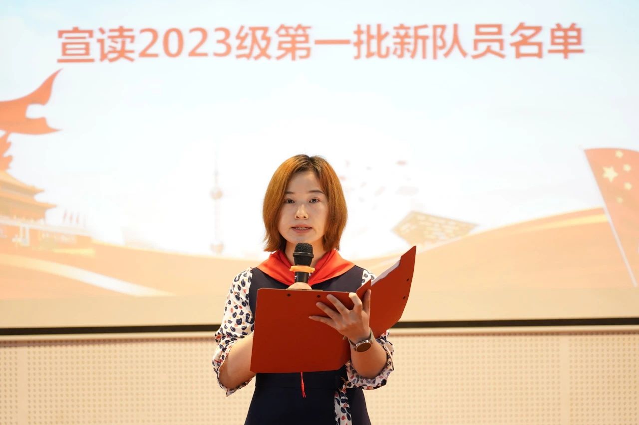 大队辅导员朱晓月老师宣读了新队员的名单。在师生的共同见证下,校领导和老师们为新队员戴上了鲜艳的红领巾。新队员个个精神饱满、神情庄重,满怀着对中国少年先锋队的期待和向往。从此刻起,他们便有了新的称号——少先队员;他们也有了新的组织——中国少年先锋队。