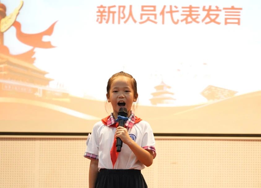 接着,来自一年6班的新队员代表杨蕙嘉发言。她说,加入少先队让她感到无比自豪。从今天起她要争当先锋,更加热爱集体、认真学习、团结同学,争取做一名优秀的少先队员。