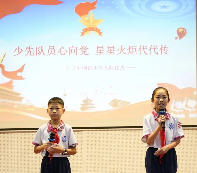 夏天的脚步已经悄然走近,在“六·一”国际儿童节即将到来之际,5月28日,白云外国语小学举行了主题为“少先队员心向党 星星火炬代代传”的新队员入队仪式,一年级7个班共有91名新队员光荣地加入了中国少年先锋队。这是他们光荣和幸福的时刻!