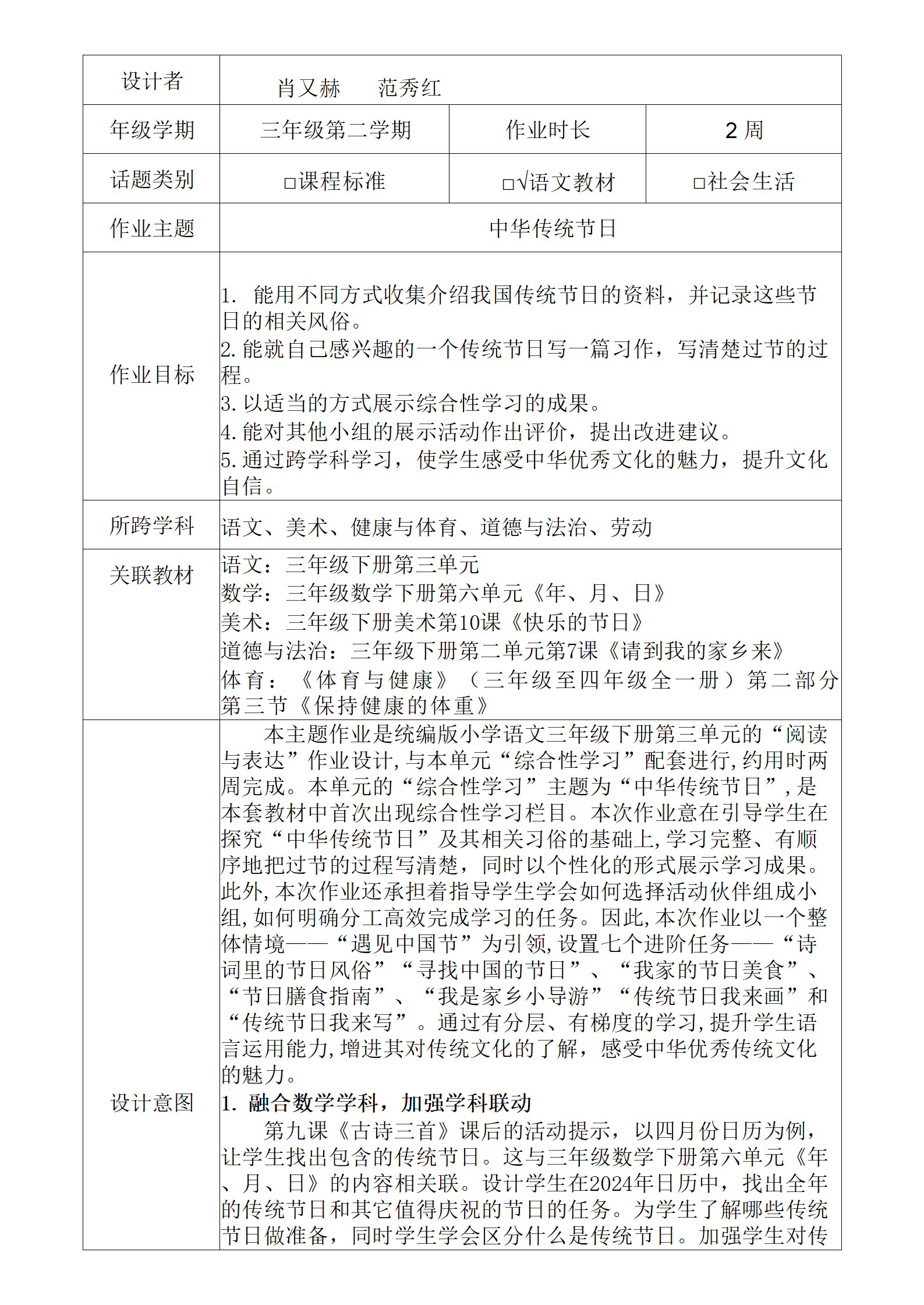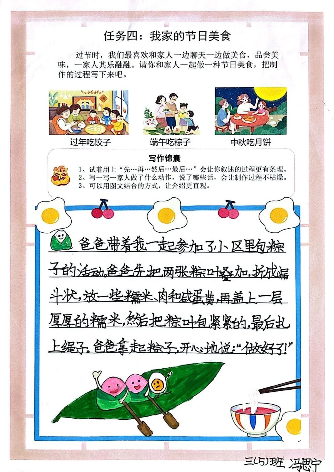 肖又赫和范秀红老师围绕“中华传统节日”展开探究,运用跨学科融合的方式,引导学生深入了解我国传统节日的文化内涵,提升文化自信。通过“诗词里的节日风俗”、“寻找中国的节日”、“我家的节日美食”等七个进阶任务,让学生在实践中学习,培养学生的综合素质,为未来的学习和生活打下坚实的基础,进一步感受中华优秀传统文化的魅力。