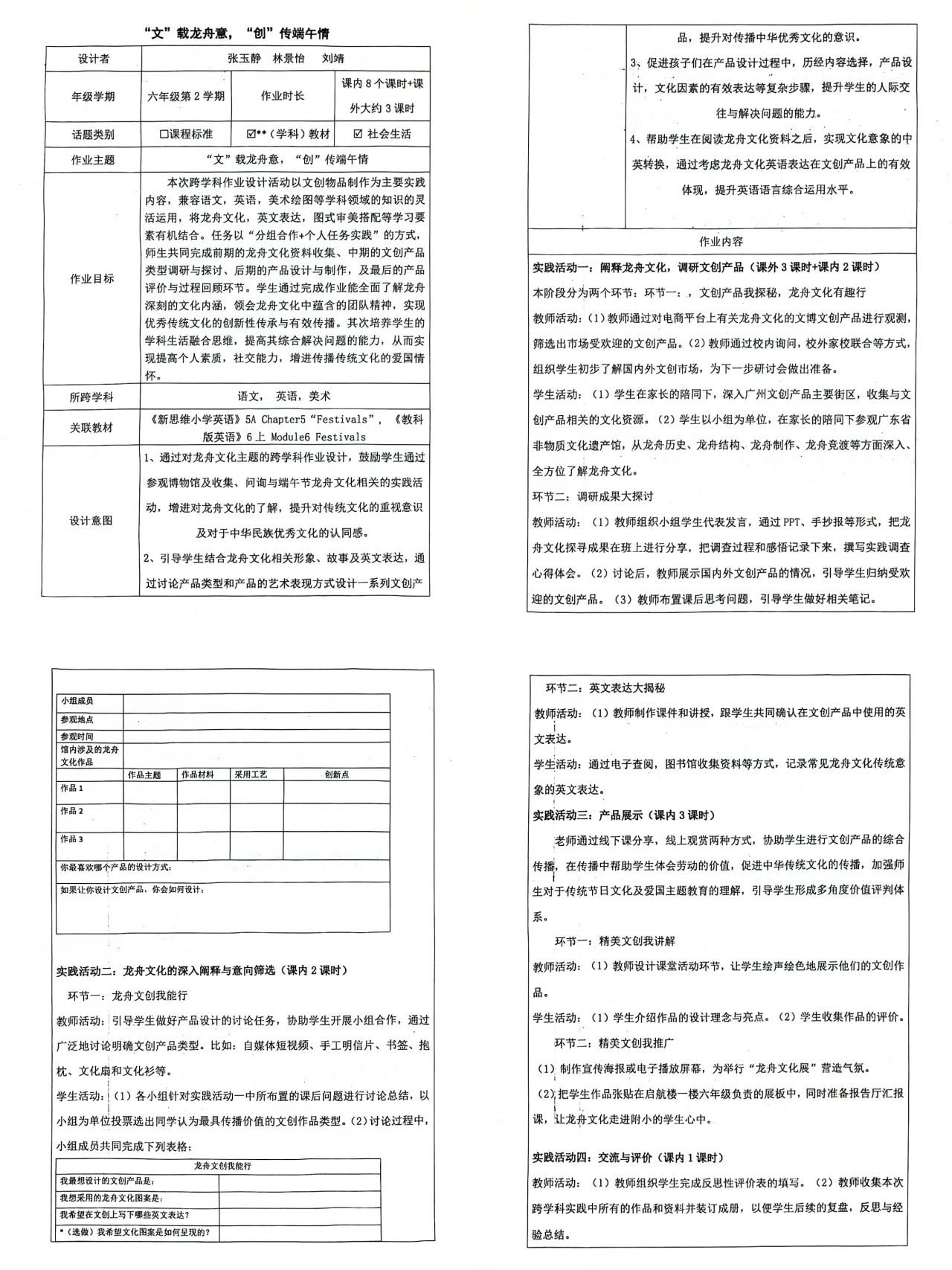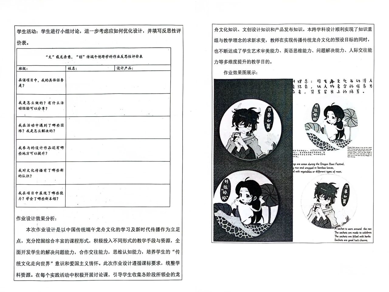 张玉静、林景怡、刘靖老师团队的本次作业设计活动以文创制作为主要实践内容,兼容语文,英语,美术,产品设计等学科领域知识的灵活运用,将龙舟文化,英文表达,图式审美搭配等学习要素有机结合。任务以“分组合作+个人实践”的方式,师生共同完成前期的龙舟文化资料收集、中期的文创产品调研、后期的产品设计与制作,及最后的产品评价与过程回顾环节。通过作业设计,培养学生深入了解中国传统文化的观念以及自主传播中国传统文化的意识,提升学生在综合场景下的英语使用能力与美术创作水平。锻炼学生的学科生活融合思维,提高其综合解决问题的能力,从而实现提高个人素质,社交能力,增进其传播传统文化的爱国情怀。