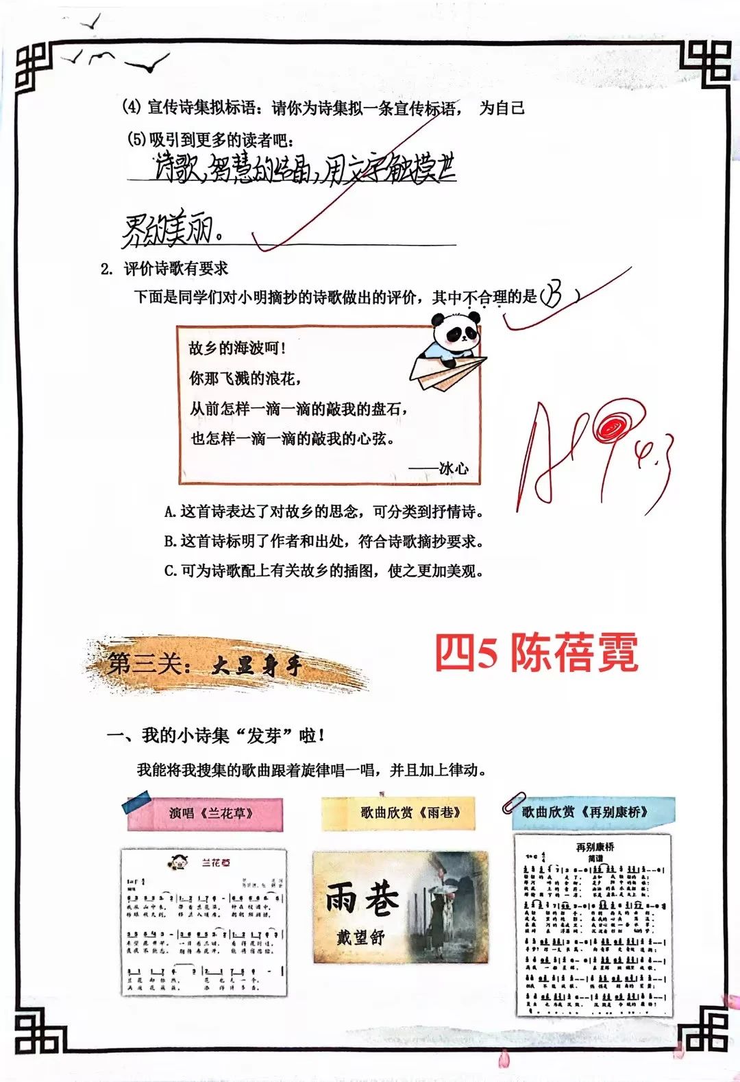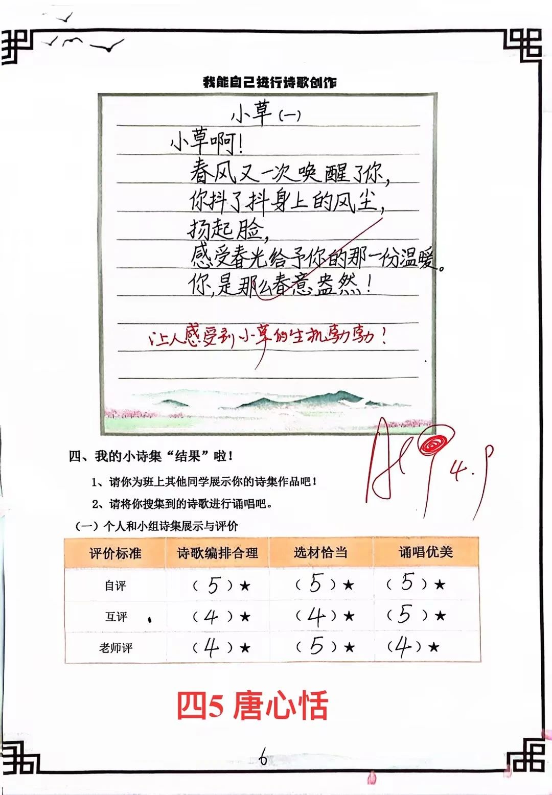 吴玲莉和朱晓月老师设计的作业内容是四年级下册第三单元综合性学习“轻叩诗歌的大门”,本次作业设计采用嵌入式结构,依托活动内容展开,与阅读教学相辅相成。将诗歌与音乐、美术学科相融合,按照内容整合程度不断提升,大致分为“初出茅庐”“小试牛刀”“大显身手”三个部分。最后从诗集编辑和诗歌诵唱两方面来展示学生学习成果。本次作业设计注重在实际作业中关注学生参与解决问题的过程,培养学生创造力、想象力、艺术思维、合作意识,促进学生综合能力的提升。