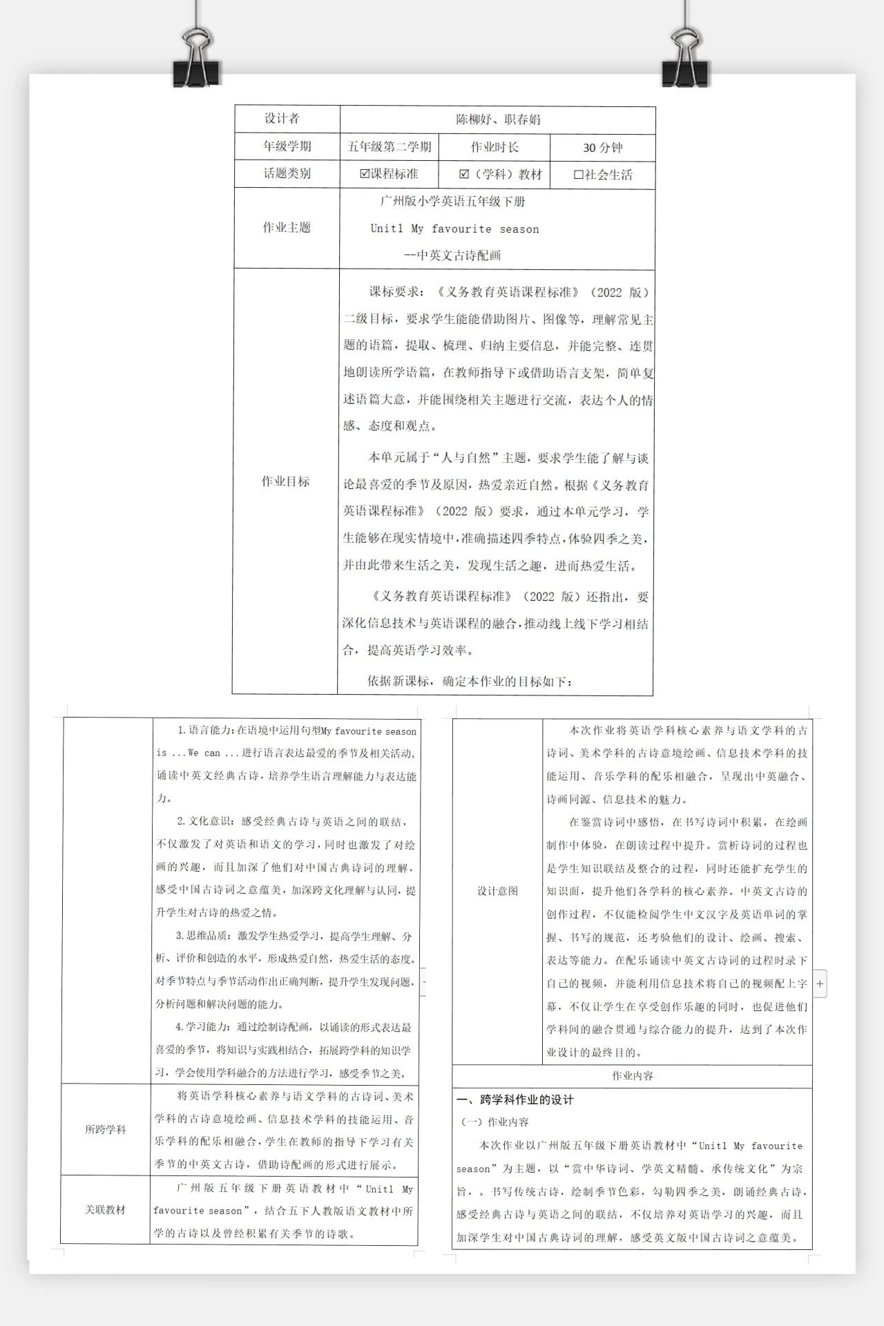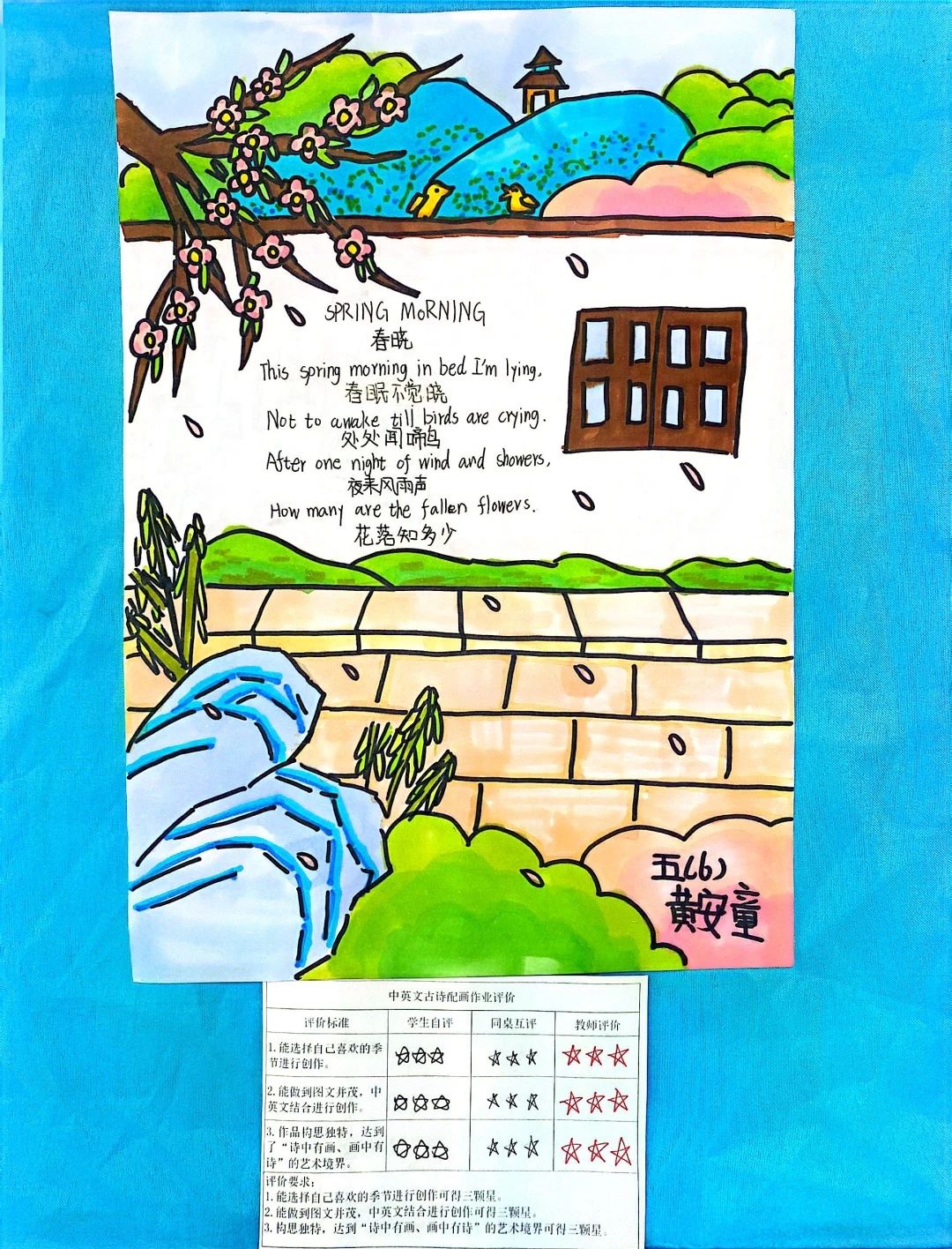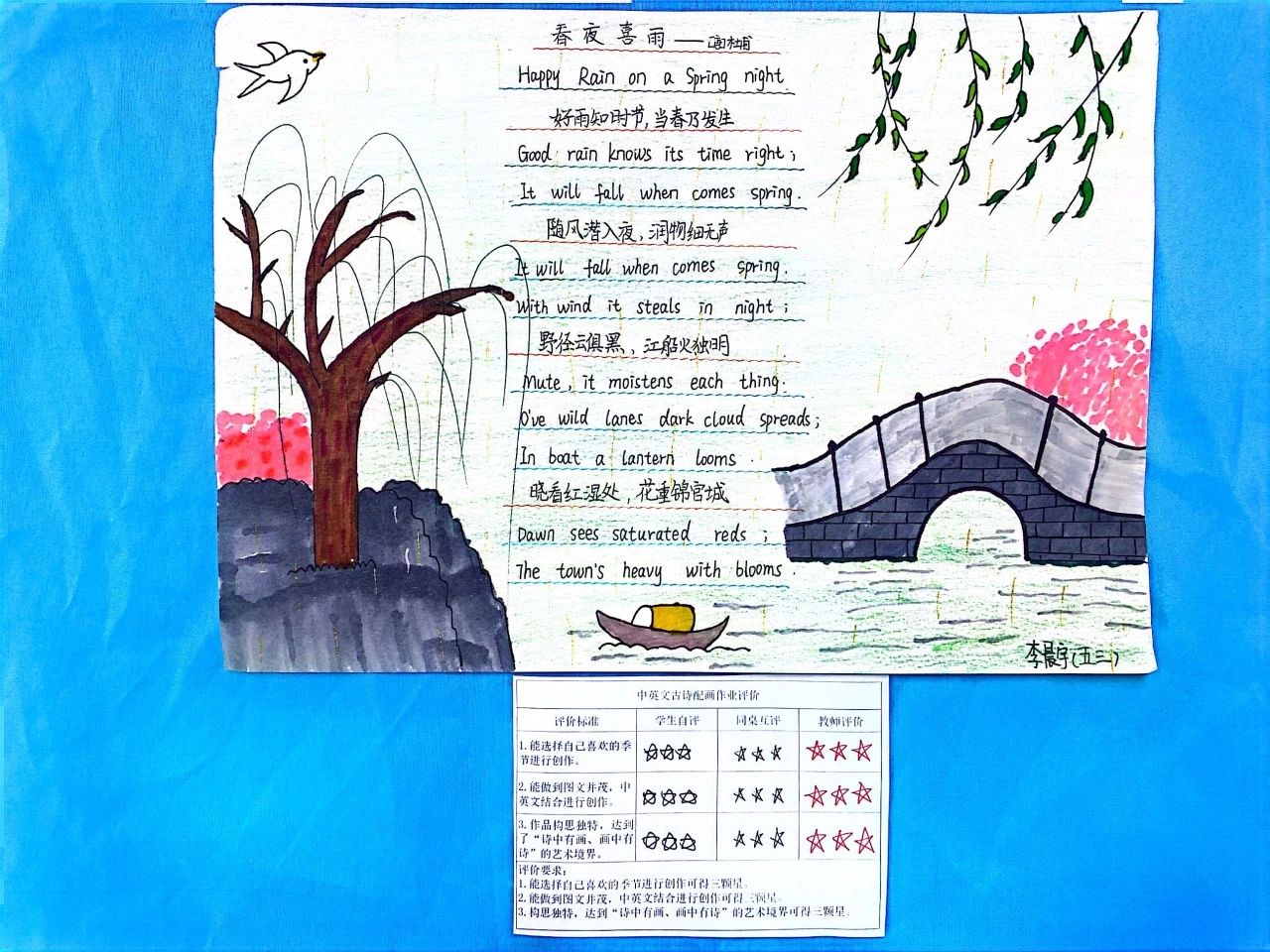 陈柳妤和职春娟老师设计的作业,将英语学科核心素养与语文学科的古诗词、美术学科的古诗意境绘画、信息技术学科的技能运用、音乐学科的配乐相融合,学生将有关季节的中英文古诗借助诗配画的形式进行展示。