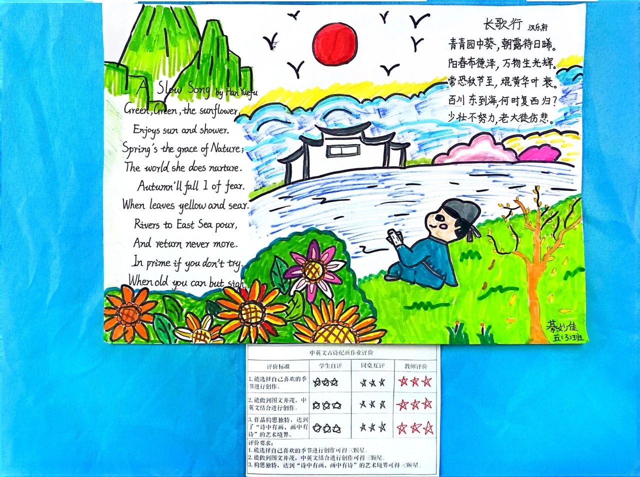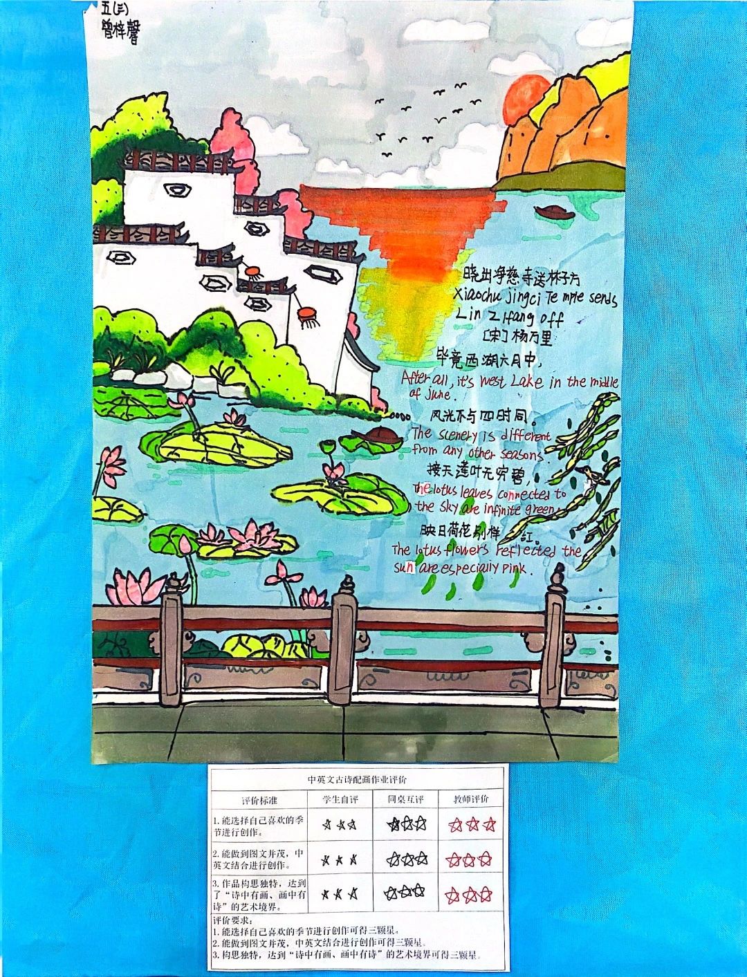 书写传统古诗,绘制季节色彩,勾勒四季之美,朗诵经典古诗,感受经典古诗与英语之间的联结,加深学生对中国古诗词的理解,感受英文版古诗词之意蕴美。