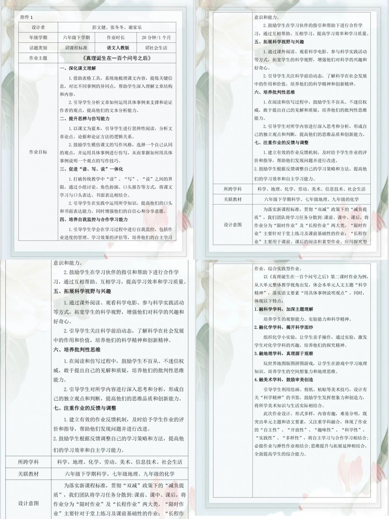 彭文健、张冬冬、谢家乐老师团队以统编版六年级下册第15课《真理诞生在一百个问号之后》第二课时作业为例,从大单元整体教学视角出发,领悟本单元人文主题“科学精神”,落实语文要素“用具体事例说明观点”。此次作业设计,形式多样,内容有趣,难易分明,既突出单元主题和语文要素,又注重学科融合,体现了作业的“自主性”、“开放性”、“趣味性”、“科学性”、“实践性”、“多样性”,将自主学习与合作学习相结合;必做作业与弹性作业相结合;思维提升与拓展延伸相结合,全面提高学生的综合能力。