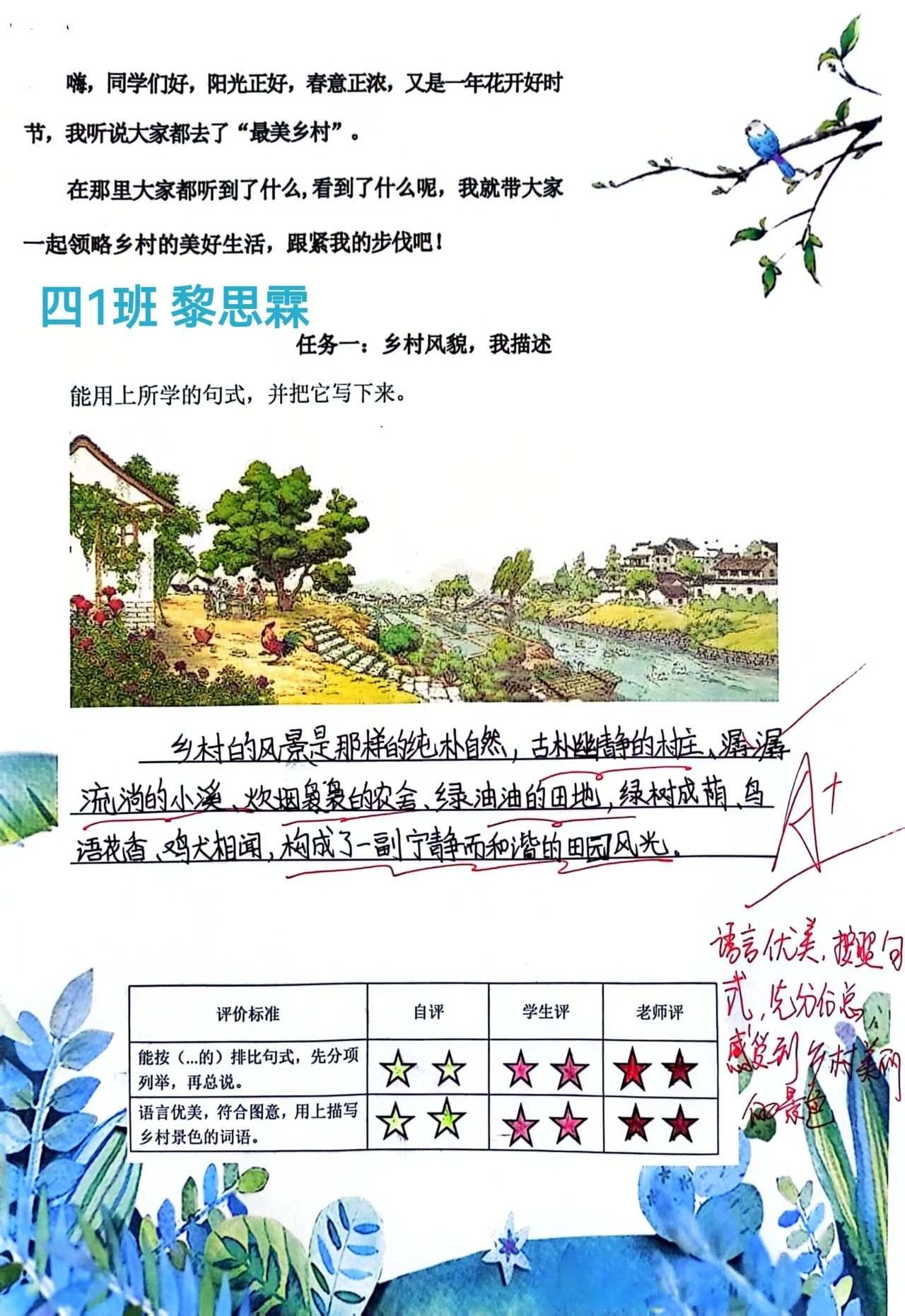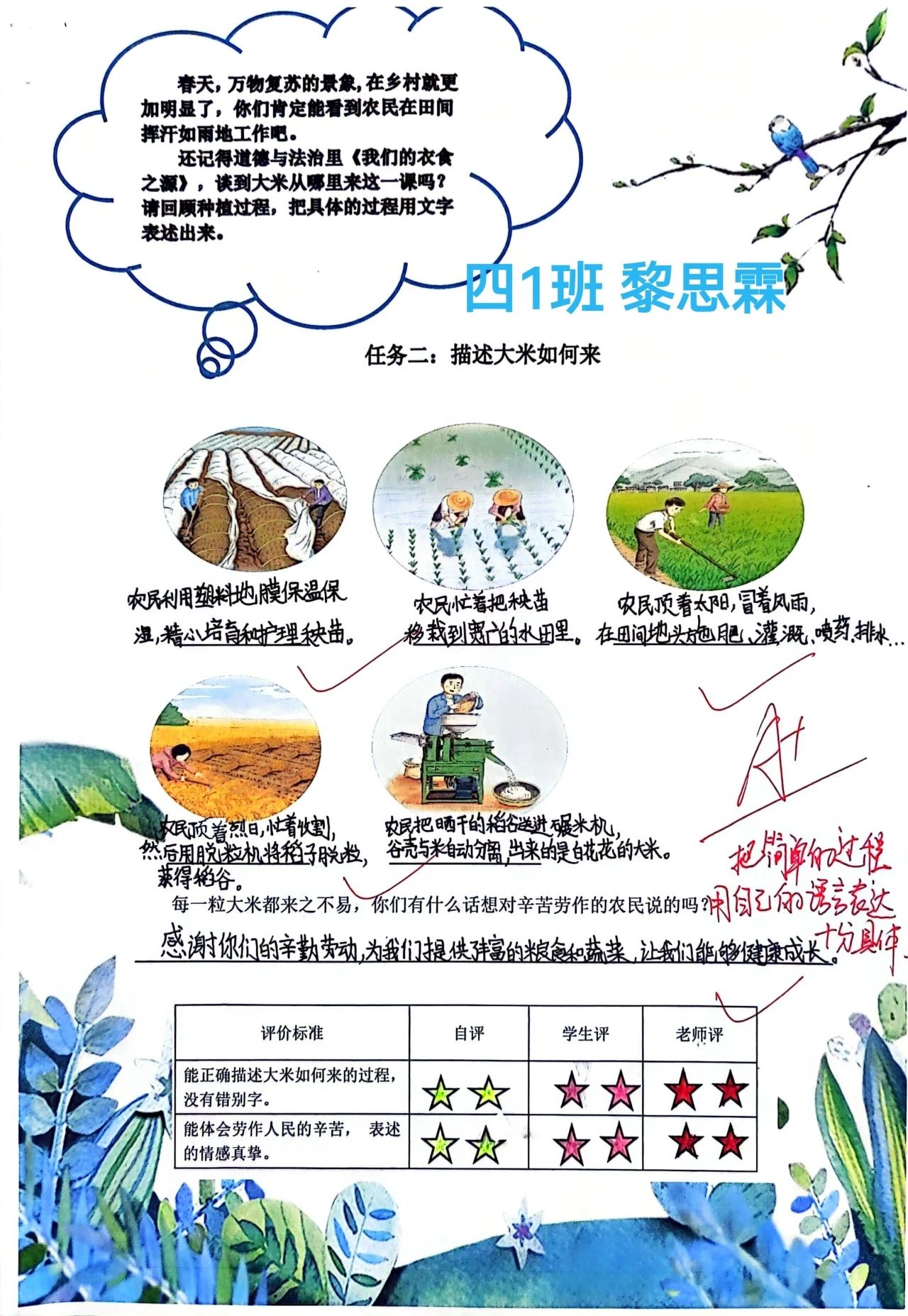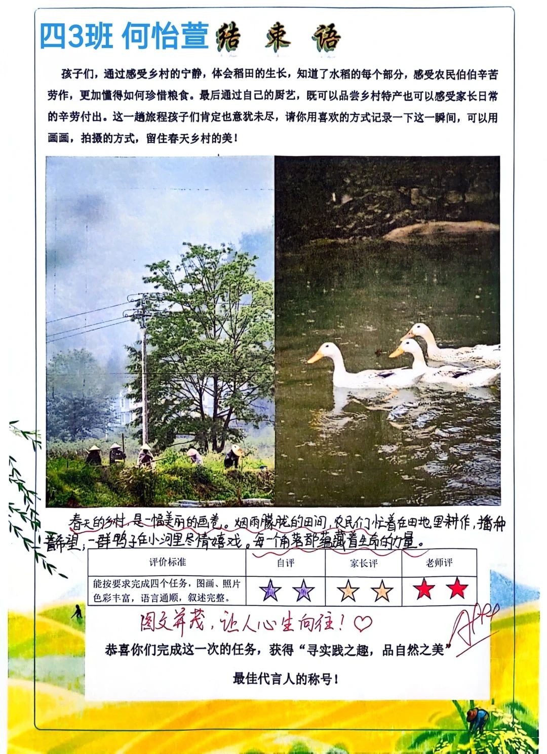 何嘉蔚和李炜星老师的作业设计“寻实践之趣,品自然之美”这一主题,是基于四年级下册《乡下人家》关于乡村生活的场景设置,将语文学习领域延伸到课外劳动实践基地、家庭、社会,在真实情境中将学习与更为广阔的世界相连。设计中的评价表从“作业内容、要求与评价”、“作业评价标准与方式”、“师生反馈的内容与方式”三方面,更好地引导学生深层次地进行观察、记录、表达、实操。在大任务的驱动下,使跨学科的实践、创意、交流成为学生真实生活的组成部分。使学生在语文学习的基础上,得到了不同程度的提升。