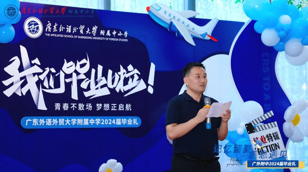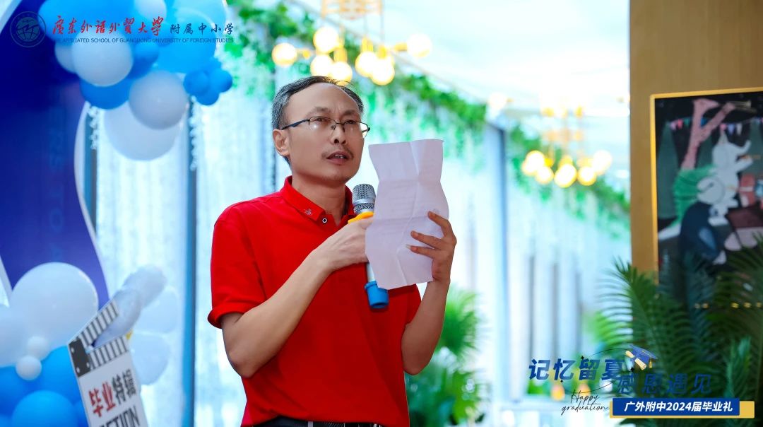 一生广外人,一世广外情。学校党支部书记兼校长方建军向圆满完成初中学业任务的莘莘学子表示最热烈的祝贺,向三年来为同学们兢兢业业、夙兴夜寐的各位老师和家长表示衷心的感谢。会上方校介绍了优秀毕业生代表的成长历程,希望同学们向榜样学习,汲取榜样力量,在未来的生涯中保持冲劲、韧劲、干劲,拥有“千磨万击还坚劲,越是艰险越向前”的决心。
