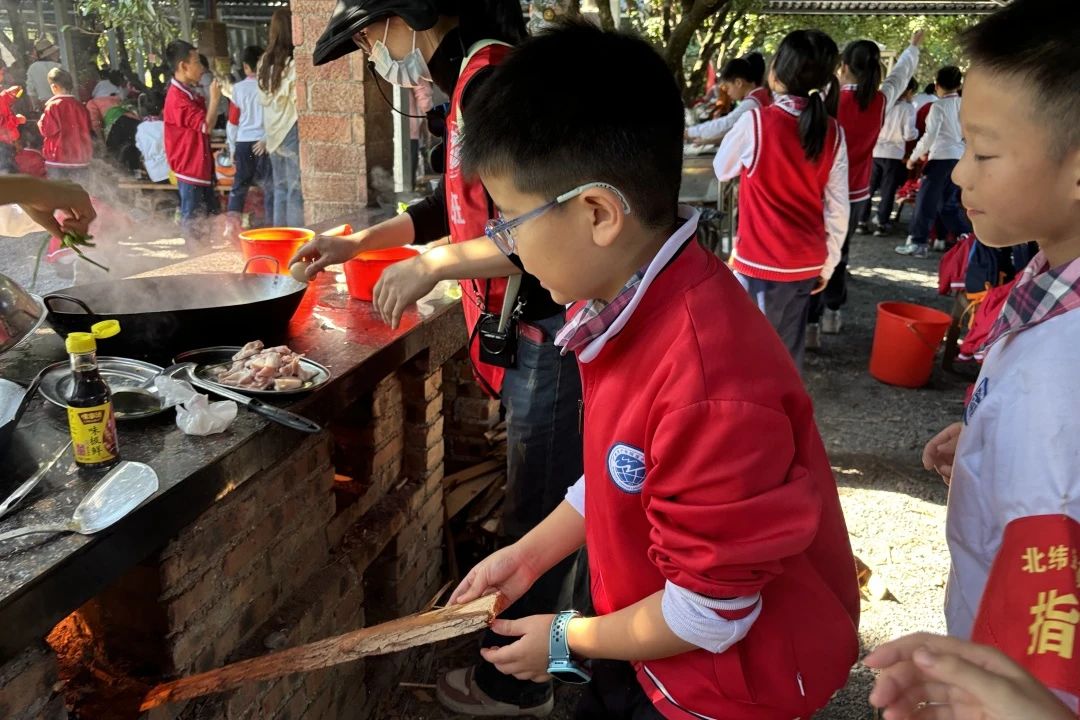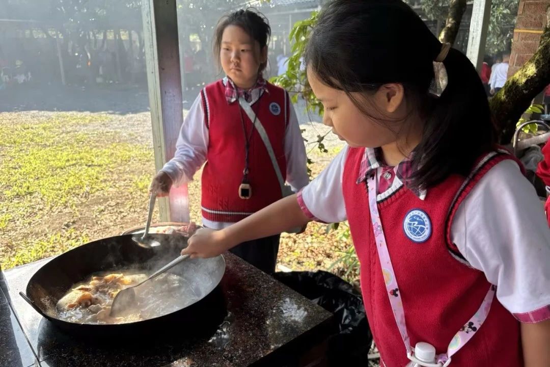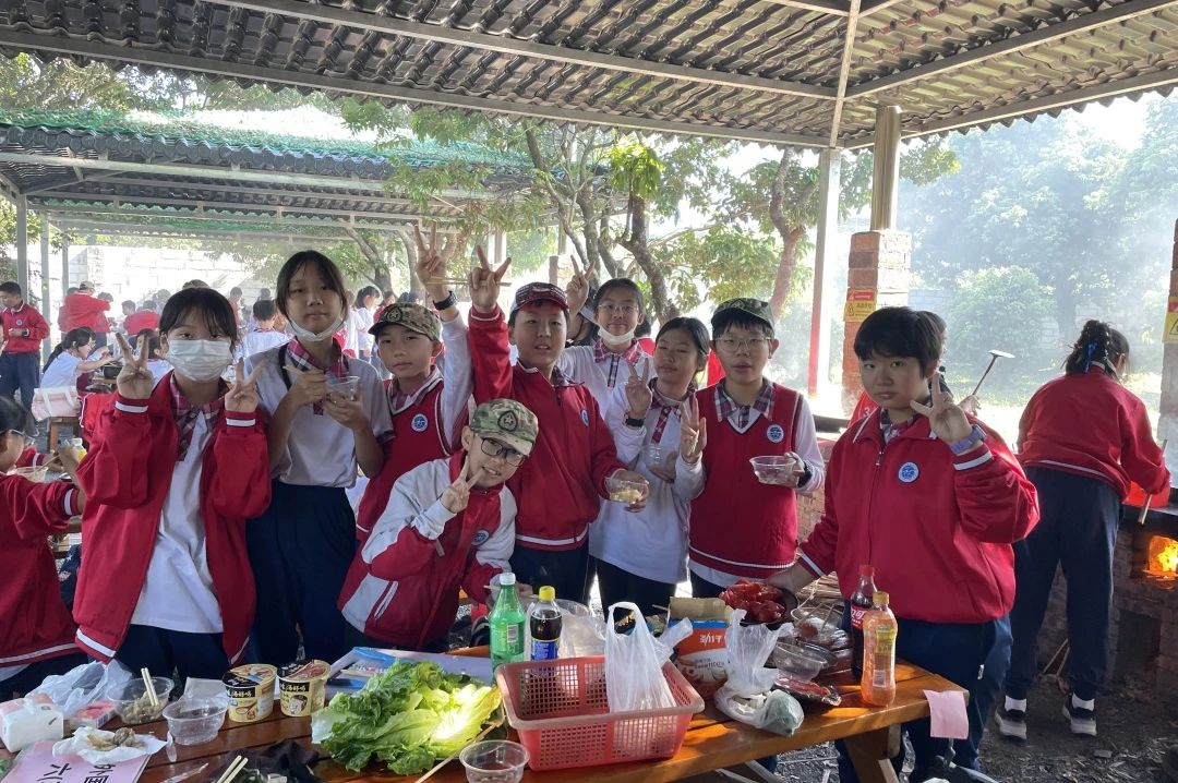 中午的活动是孩子们特别期待的——荔枝林野炊。每班提前分好小组,由学生自己烹饪,食材丰富,有斩小件的走地鸡、鱼腐、土猪肉、鸡中翼、土鸡蛋、玉米粒、火腿肠、西红柿、青瓜、营地时蔬、紫菜等,这些食材在孩子们团结协作下都变成了美味可口的菜肴。自己做的午餐吃起来格外香,孩子们吃得津津有味。吃饭的“我们”最乖最听话,一张张灿烂的笑脸,纯真的笑容,如春天的阳光,温暖明媚,让人心情舒畅。
