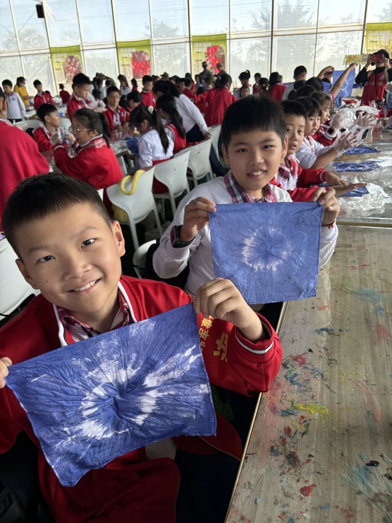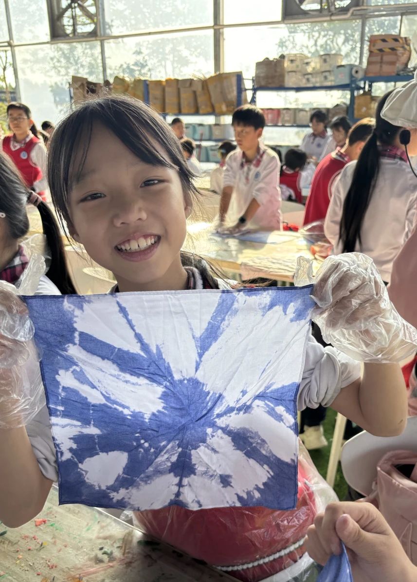 扎染,作为中国民间传统而独特的染色工艺,历史悠久,其独特的艺术效果和丰富的文化内涵令人着迷。活动现场,专业的老师首先为大家详细介绍了扎染的起源、发展和制作技巧。孩子们在老师的指导下,纷纷发挥自己的创意,将白色的布料通过捆扎、折叠、扭曲等手法进行预处理,然后浸入色彩斑斓的染料中。当解开扎线,一幅幅独一无二、充满惊喜的扎染作品便呈现在眼前。有的如绚烂的星空,有的似灵动的水波,每一件作品都展现了孩子们的个性与想象。