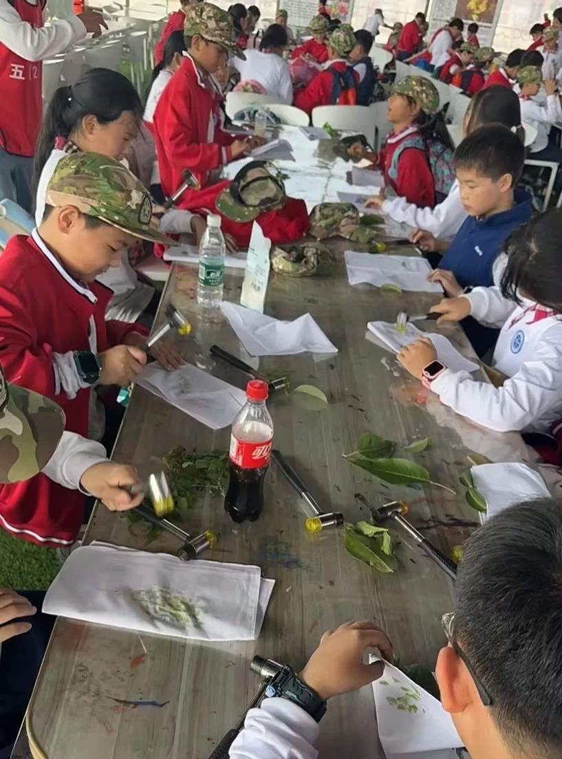 学生们精心挑选着自己喜爱的鲜花和树叶,在白色的布料上进行创意组合。通过轻轻敲击,植物的形状和色彩渐渐印染在布料上,形成了一幅幅独特而美丽的作品。植物拓印不仅是一种艺术创作方式,更是人们与大自然亲密接触的桥梁。同学们在感受大自然神奇魅力的同时,也充分发挥了自己的想象力和创造力。