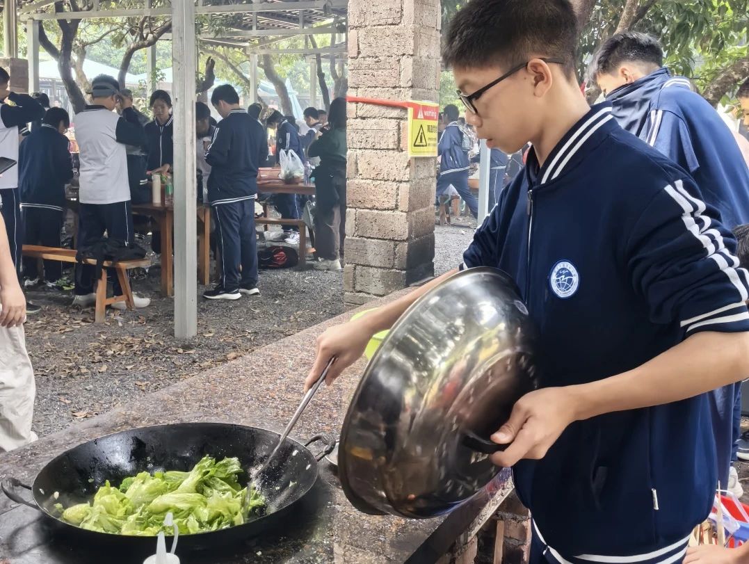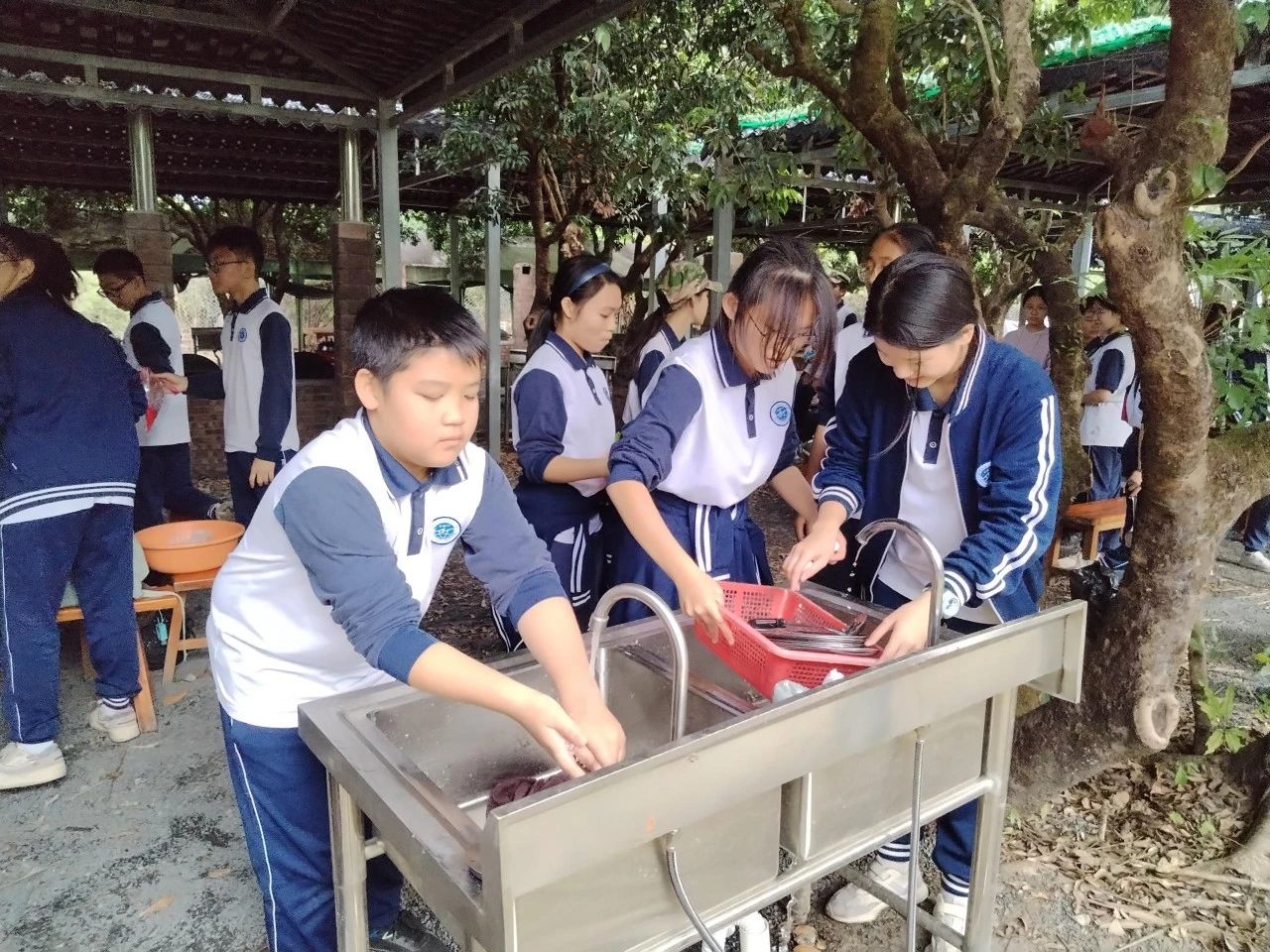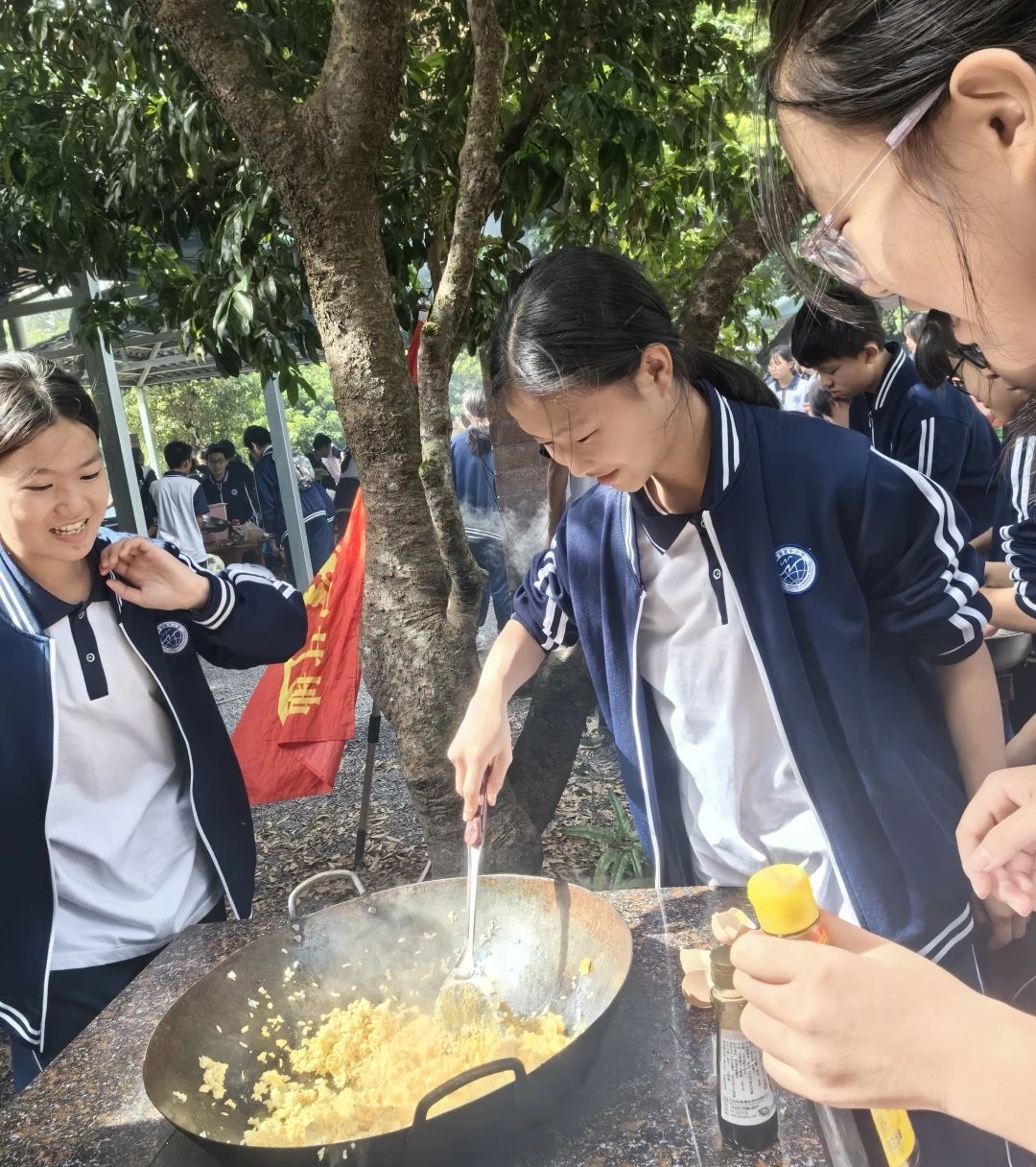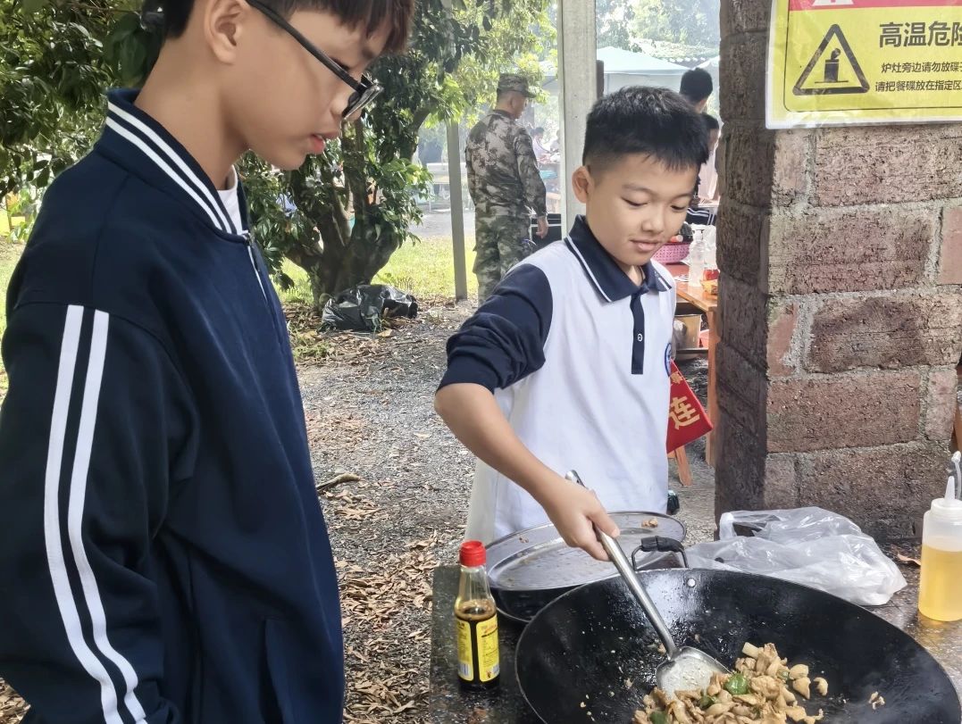 这一回,同学们化身为小小炊事员,在柴火灶前,“作战”柴米油盐。鸡蛋8个,破壳,撒盐,搅拌均匀;番茄5个,洗净,切片。热锅下油,炒熟番茄,后下鸡蛋,加点酱油加点糖,出炉一份色香味俱全的番茄炒蛋!还有葱爆鸡丁,青瓜小炒肉,蒜炒生菜……少年大厨的手艺得到同龄伙伴们的一致点赞。荔枝柴燃起的火焰,映照着一旁的简陋圆桌;围坐的少年们,享受自己的劳动成果,充实而喜悦。劳动最光荣!