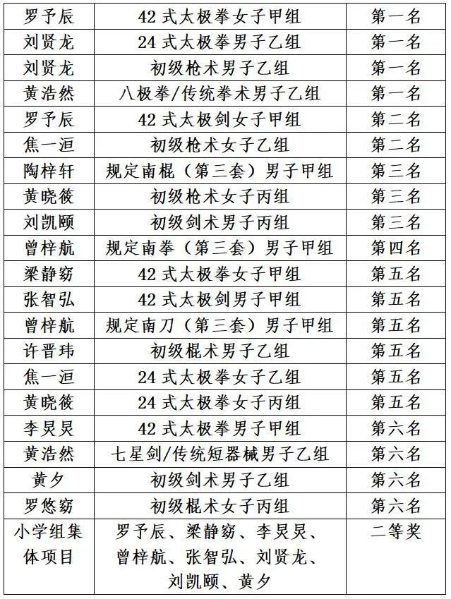 此次武术比赛的优异成绩,离不开学校领导的高度重视和大力支持,离不开老师们的辛勤付出和悉心指导,离不开家长们的大力支持和耐心陪伴,更离不开孩子们的努力拼搏和坚持不懈。这不仅是对孩子们武术技能的一次检验,更是对他们意志品质的一次磨砺。通过这次比赛,孩子们不仅收获了荣誉,更收获了自信和成长。