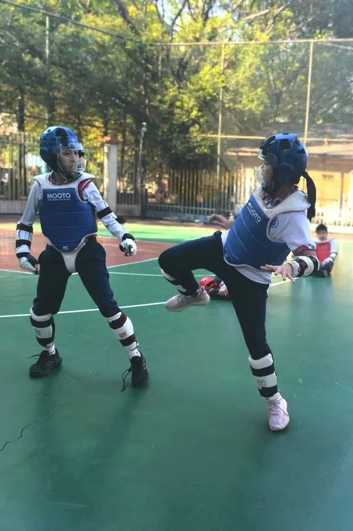 跆拳道比赛不仅是选手技艺的较量和切磋,还有战术、打法的PK,更是心态、韧劲、斗志的挑战!所以要想参加比赛就得有过硬的技战术、良好的心态、顽强的毅力。唐晓霞老师带动跆拳道队的孩子们持续坚持训练,并在赛前进行集训,针对学生前腿技术、单击、组合技术,针对不同对手的实战演练等进行强化练习,让学生逐步进入比赛状态。跆拳道队员们刻苦训练,认真练习每个腿法,进行模拟实战,练习同水平,不同水平、身高选手的打法和对策,以便应对比赛中的对手。针对初中高级品势比赛—高丽,根据比赛规则和打分,细抠每个动作,纠正动作发力、发声、节奏,争取在比赛中有精彩的表现。