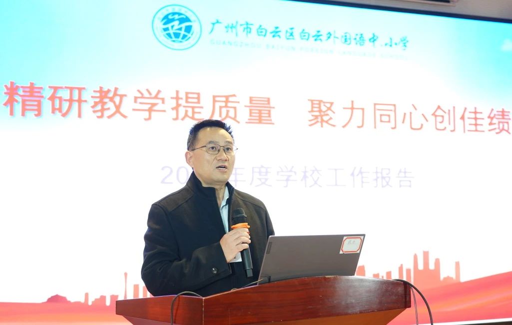 随后,党支部书记、校长方建军发表了题为《精研教学提质量 聚力同心创佳绩》的工作报告。报告中,方校长全面回顾了过去一年学校在党建引领、教学管理、课程建设、活动育人、教师团队建设、校园安全、校园文化建设及后勤保障等方面取得的显著成果,展现了学校在教育事业的卓越贡献。