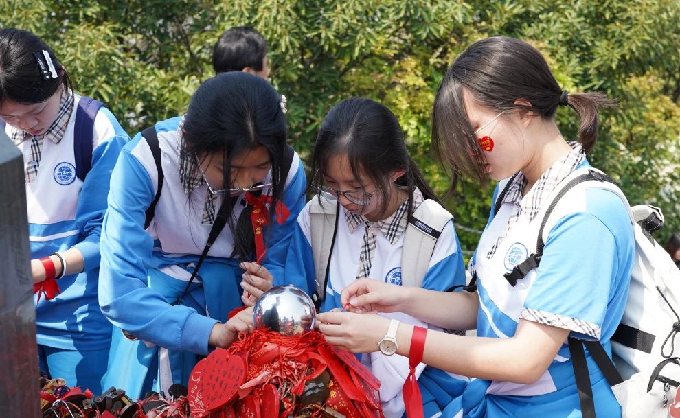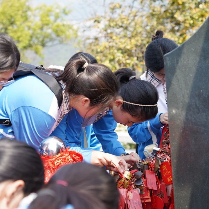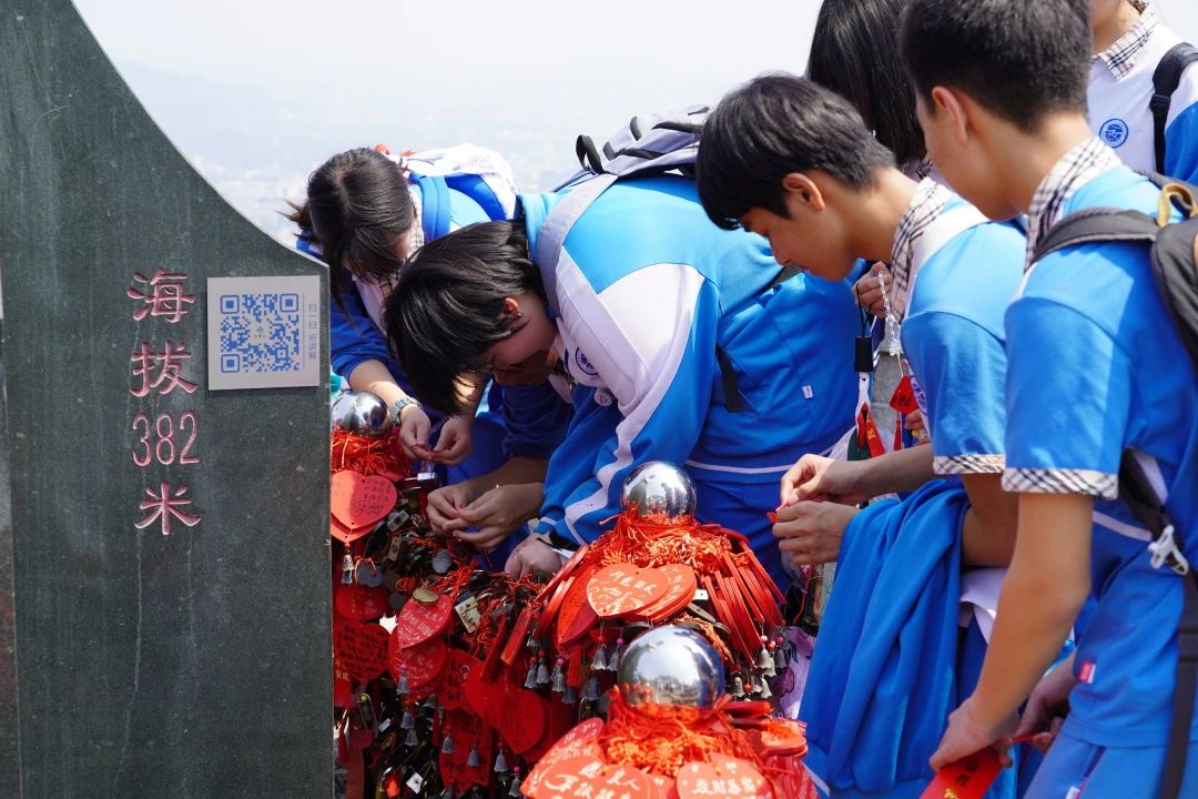 历时两个小时,师生们雄赳赳气昂昂在山间小路上前行,整齐行进间,我们看到了师生的坚定的信念;快速有序间,我们看到了师生对“必胜”的渴望。师生士气满满,登顶白云山,将写满目标的许愿带和许愿牌系于摩星岭。山风拂过,红绸如火焰跃动,许愿牌翻飞作响,见证少年对未来的庄严期许。同学们整齐排队,手持登顶奖状,再次喊出心中的誓言,铿锵坚定的声音响彻摩星岭山顶!山河见证少年的誓言,期待百日后学子能圆梦七月!