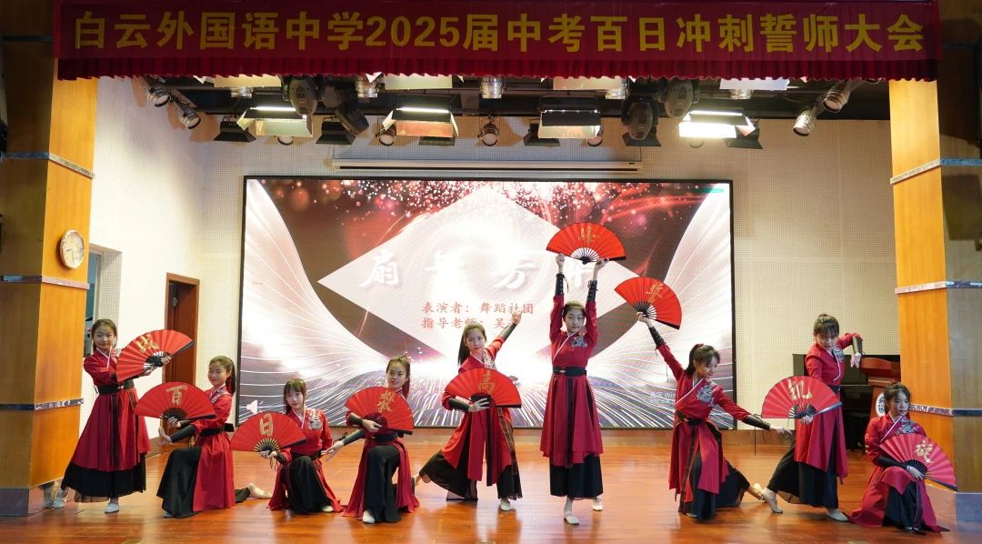 漫漫征途,百日大战。学校舞蹈社团的学生以一支《扇舞芳华》的舞蹈点燃了全场的气氛,以此激励同学们以自信昂扬姿态迎战中考。