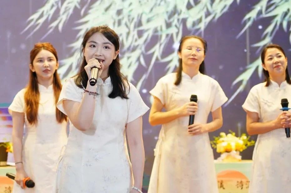 教师节目《如果没有李白》以时空对话形式展开,五位教师化身“诗仙代言人”,在光影交错间演绎千年文脉。“床前明月光”的思乡情愫、“仰天长啸”的狂放不羁、“两岸猿声”的豁达释然,通过教师们的吟咏,立体的李白展现于眼前。表演尾声,粤语版《静夜思》与普通话朗诵交织,恰似“地上霜”与“明月魂”的对话,整个礼堂仿佛回荡着盛唐的钟磬之音。这场表演不仅是对诗仙的致敬,更是对“诗酒趁年华”文化基因的深情礼赞。