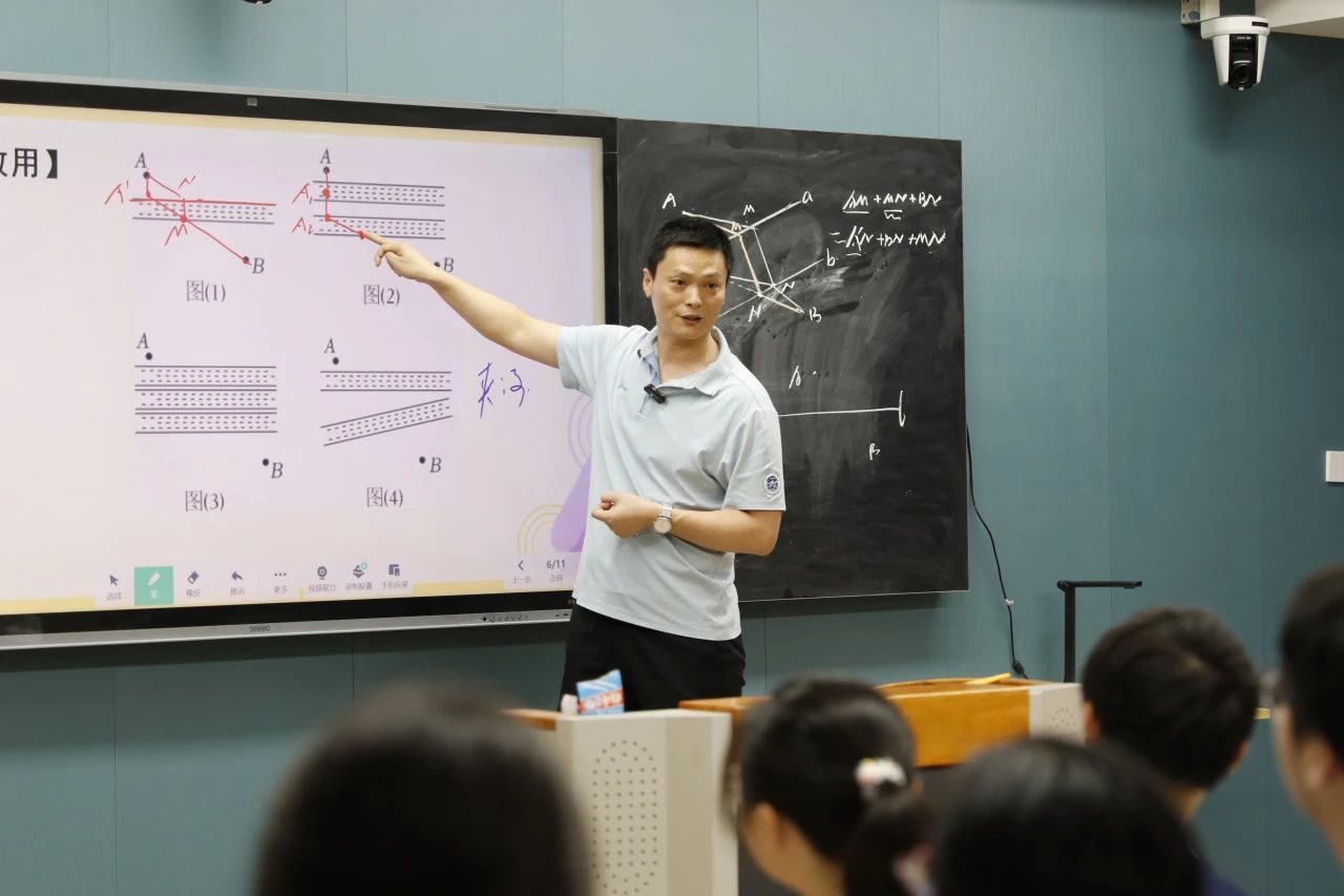 第二节是薛锋老师执教的《造桥选址》数学公开课,薛老师带领孩子们一起探索了一个既经典又充满挑战的数学问题:两条平行河流上造一座垂直的桥,使得从A地到B地的路径最短。这不仅是中考的热点难题,更是锻炼几何思维的金钥匙!