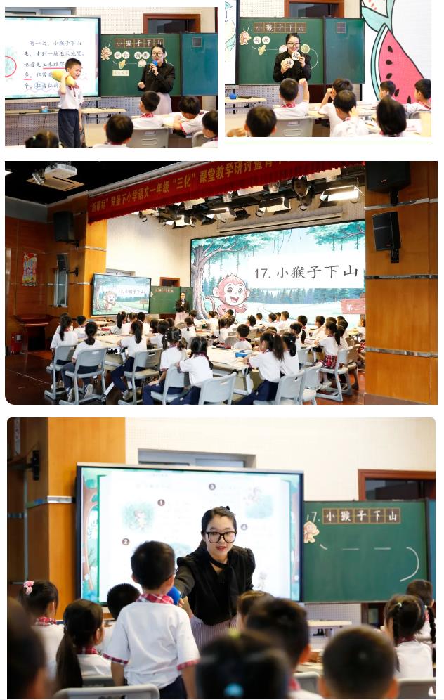 在课例研讨环节,两场风格迥异的教学展示体现了“三化”理念的多元落地——广州市第六十五中学附属小学黄绮琪老师执教《小猴子下山》,以动画短片创设“小猴子准备派对食物”的情境,通过“动作模仿秀”“我来演演小猴子”等游戏化设计,引导学生在角色扮演中理解“小猴子三心二意”的行为逻辑。她巧妙利用一年级孩子爱表演的特点,将抽象的“动词”学习转化为孩子们创编小猴子路过玉米地、桃树下、西瓜田的各种动作演绎,让低龄学生在趣味活动中掌握文本核心内容。