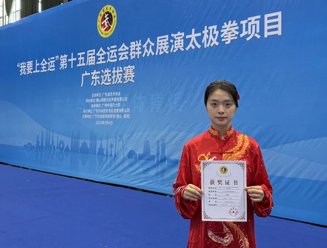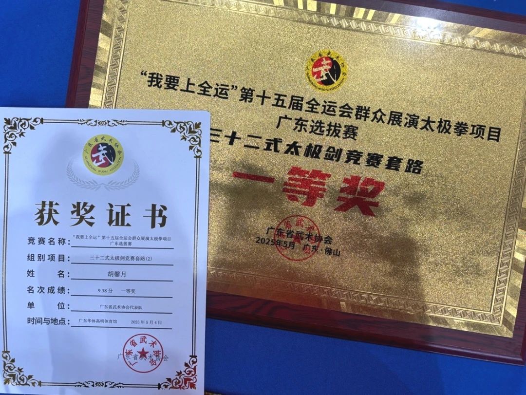 由广东省武术协会举办的第十五届全运会群众展演太极拳项目广东省选拔赛于5月4日在佛山华体高明体育馆开赛,赛事共设5个竞赛项目,吸引全省多支代表队报名参加,其中有62岁的太极名将,也有20岁的武术新星。年龄从来不是界限,而是流淌在武术长河中最动人的浪花。每一位队员都是经过层层严苛选拔脱颖而出。其中我校胡馨月老师无畏强敌,在集体太极剑中全力拼搏,整个团队凭借沉稳的心态与精湛的技艺斩获一等奖!这不仅是个人荣誉的加冕,更是团队精神与岭南武术文化的璀璨绽放。