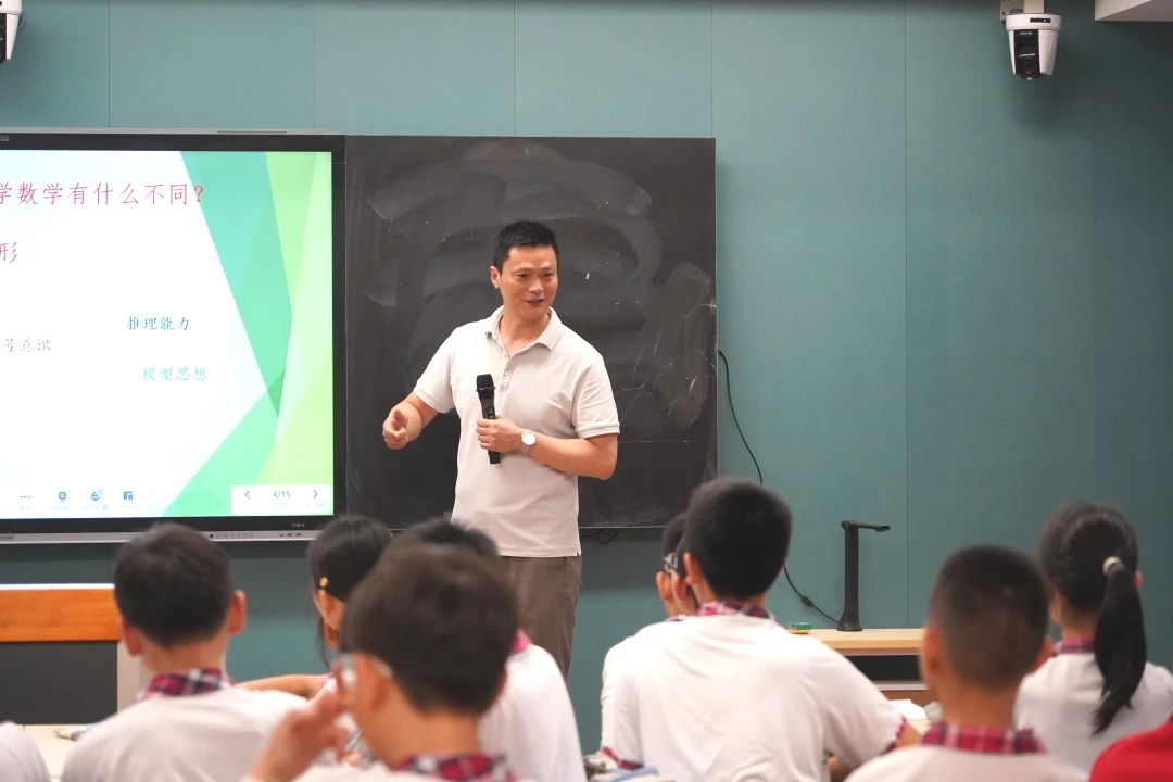 数学薛锋老师为让学生理解初中与小学数学核心差异,设计从数字规律归纳到方程建立再到函数抽象的教学流程,引导学生完成“实际问题—数学模型”转化,体验数学建模思想。通过数轴表示有理数、直线可视化方程解集,帮助学生建立代数与几何关联认知,领会数形结合精髓。借助平行四边形面积公式推导,揭示初中几何重论证过程的本质。本节课消除学生对初中数学的陌生感,以建模、数形结合和逻辑推理搭建初步认知桥梁,学生表现出思维跃迁意愿,为后续学习奠定兴趣基础。