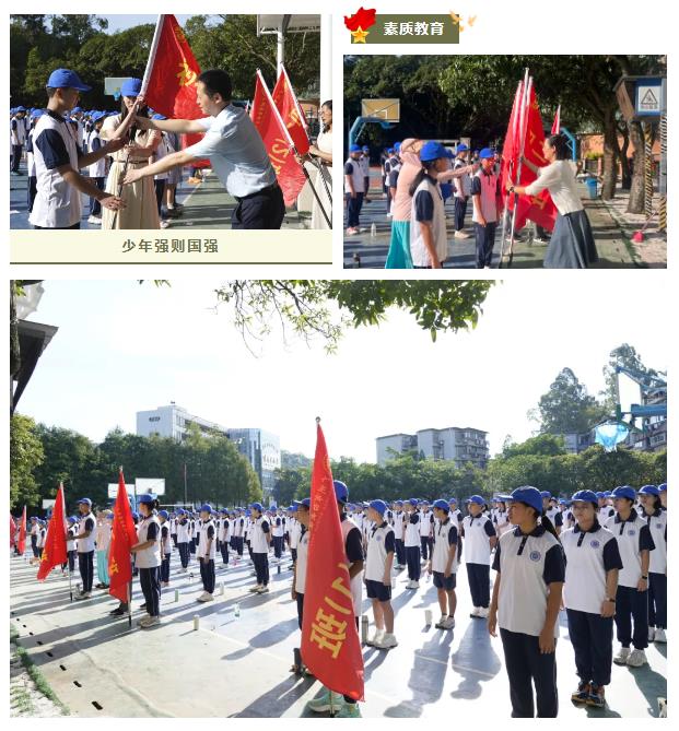 8时整,仪式在激昂的氛围中启动。党支部书记、校长方建军,党支部副书记朱传兵,副校长黄秋敏,以及中学学生发展中心老师、初一及初二年级全体师生、全体教官共同参与了本次活动。