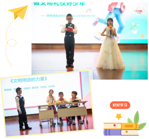 四年级的集会主题为“做文明礼仪好少年”,本次集会由四(3)班刘胤琦和四(6)班的刘謦尹同学联袂主持。