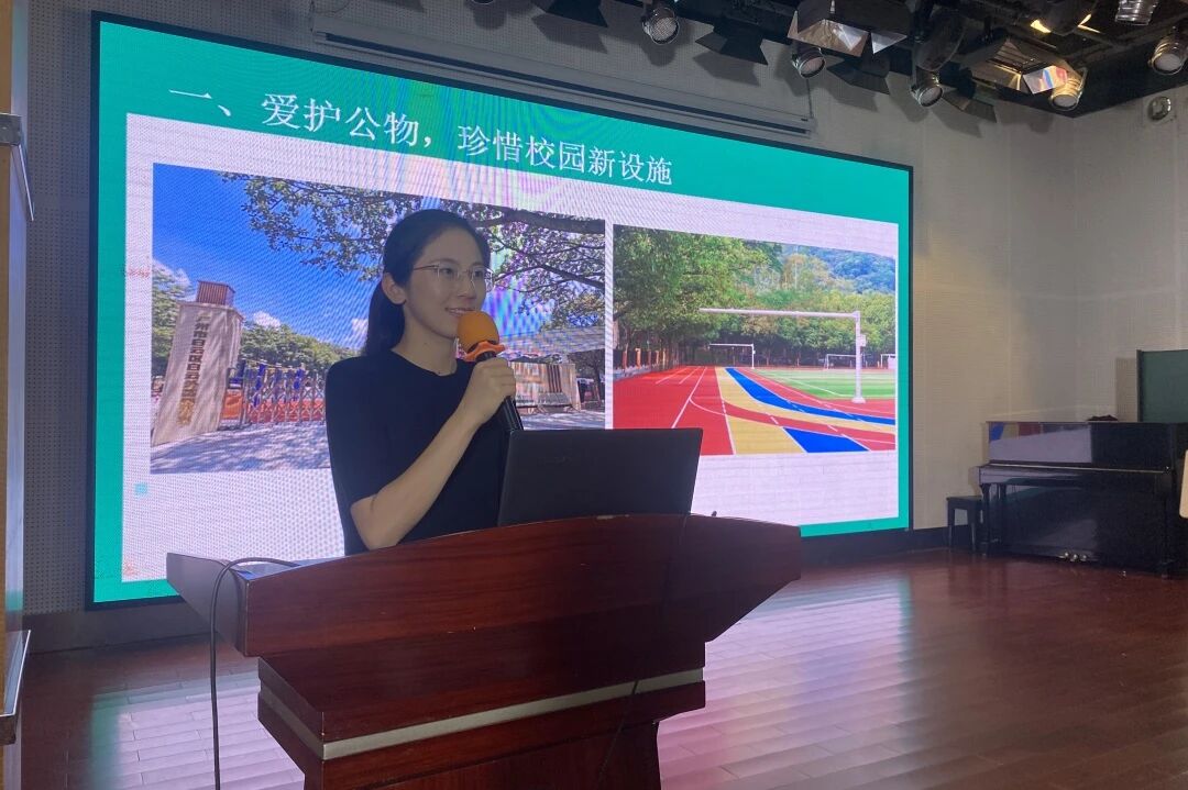 级长陈柳妤老师上台讲话,将文明习惯比作成长“好朋友”,叮嘱同学们从点滴小事养成良好品行,为低年级的学弟学妹树立好榜样。