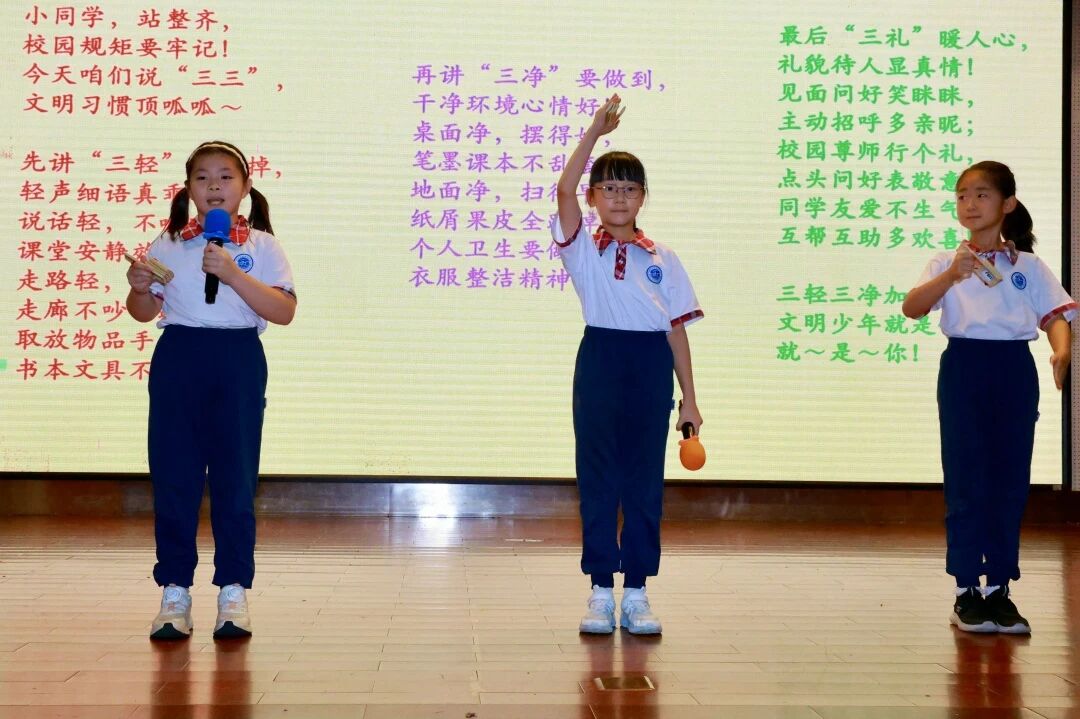 接着,三年级2班、3班、4班的学生代表带来《三轻、三静、三礼》快板表演,节奏明快的语言将文明规范生动呈现,赢得全场掌声。