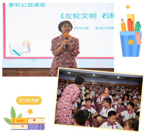 赵杰级长特邀四年级2班宋迩行同学的家长,开展了以《左轮文明、右轮纪律》为主题的公益课堂。