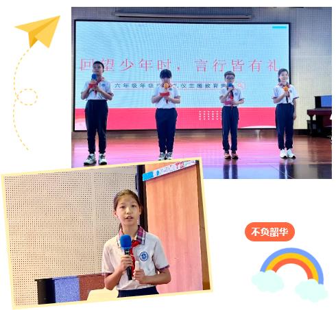 六年级师生共同参与了以“回望少年时,言行皆有礼”为主题的集会活动。活动流程紧凑而精彩,在四位主持人的开场白后,六5班的罗振媛同学以从容淡定的姿态,进行了生动的文明礼仪演讲,并在结束前引领全场同学重温了文明礼仪古训,氛围庄重而温馨。