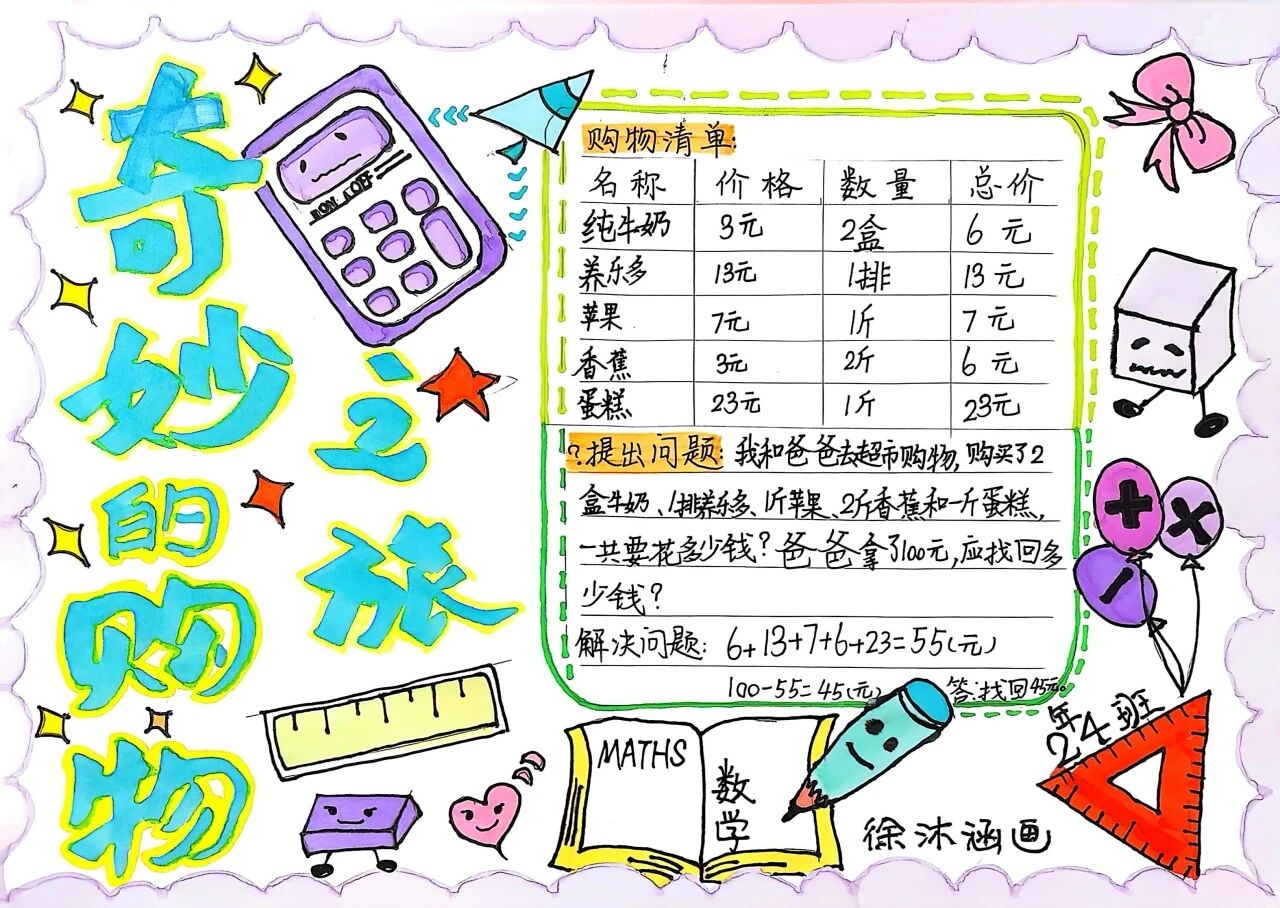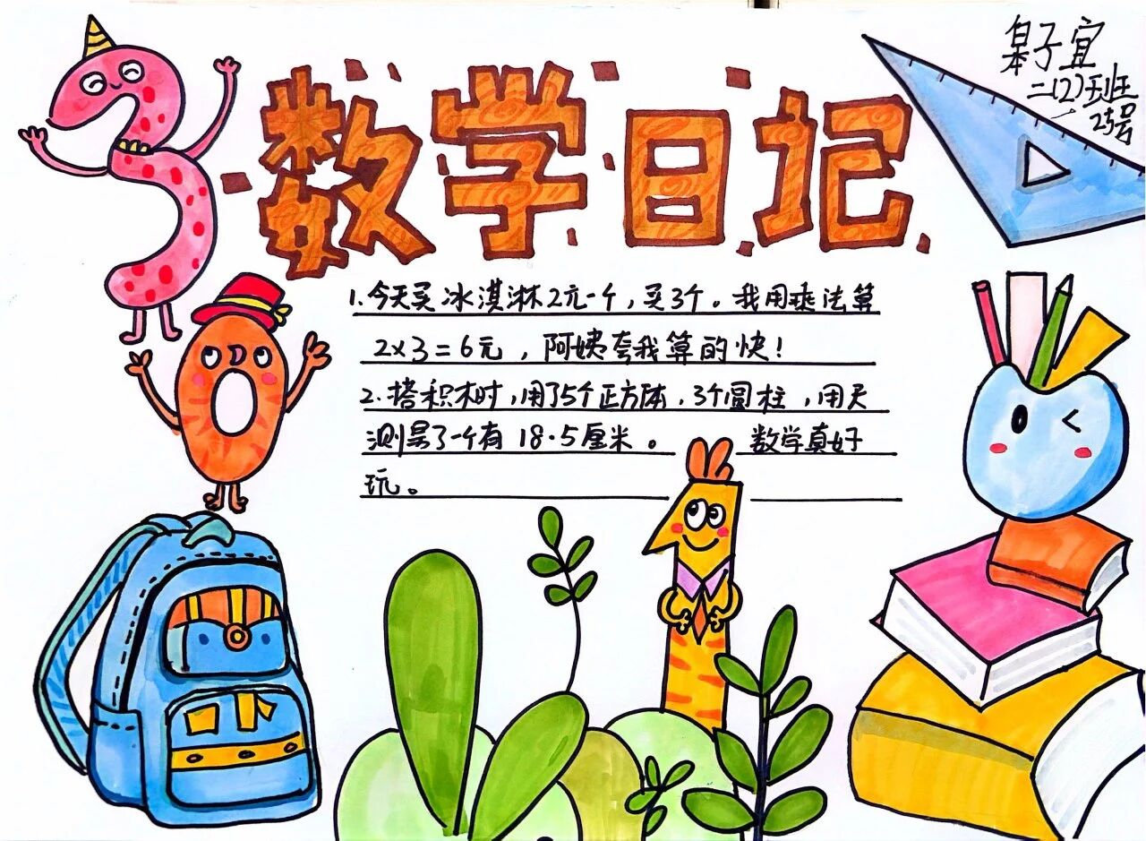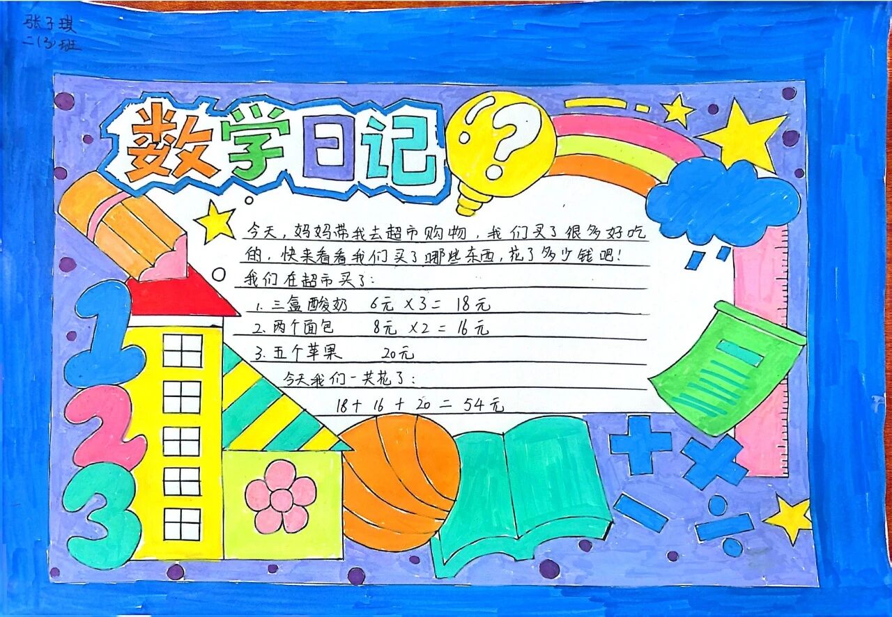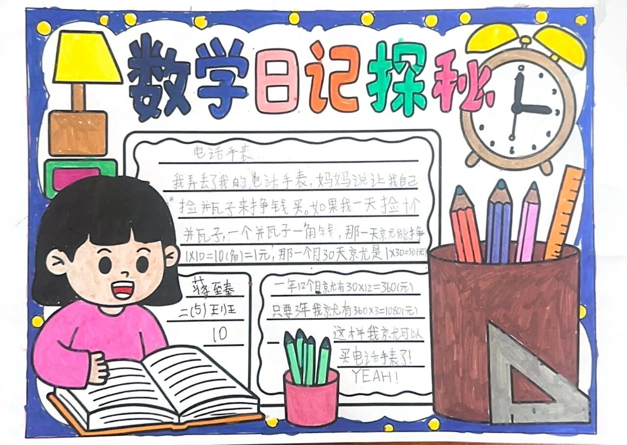 二年级学生以文字为载体,记录生活中的数学现象与课堂所学知识点。日记语句通顺、逻辑清晰,部分同学还配上了简洁形象的插图。从商场购物的价格计算到家庭作息的时间规划,孩子们用数学眼光观察生活,用文字表达对数学的探索热情,展现了扎实的表达能力与数感素养。