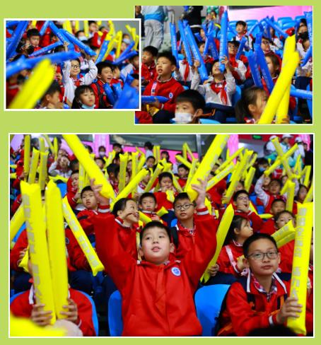 “加油!加油!”看台上,三年级的孩子们呐喊声此起彼伏。有孩子举着写有“加油”的笔记本,小脸涨得通红却依旧坚持呐喊;有孩子握着印着“飞向美好未来”的应援棒,跟着比赛节奏用力挥舞。他们的助威不分阵营,无论是哪支队伍的精彩表现,都会收获孩子们最真诚的喝彩。
