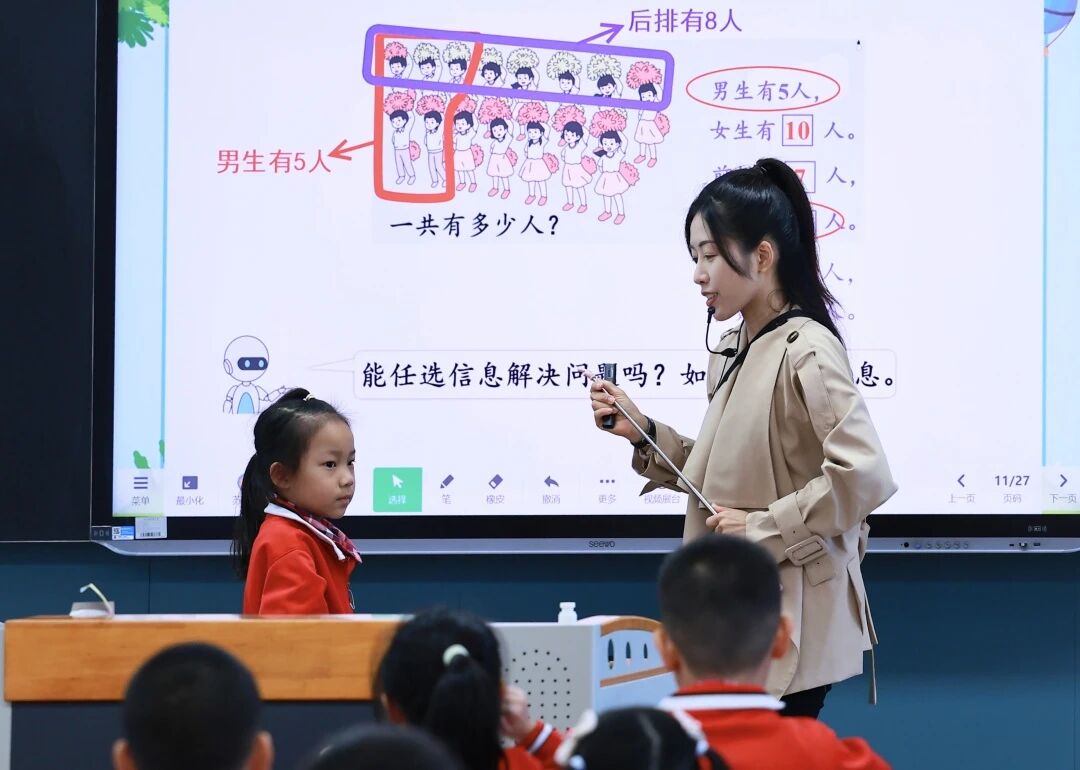 在数字技术与基础教育深度融合的当下,数学组苏洁薇老师执教《从多角度解决问题》,苏老师以AI技术为核心驱动力,为学生打造了一堂沉浸式、趣味化的数学思维启蒙课,充分彰显了科技赋能小学数学课堂的创新魅力。整堂课以AI技术为桥梁,打破了传统数学课堂的静态教学模式。生动的视频画面降低了低年级学生的认知难度,趣味化的呈现方式激发了学生主动思考的兴趣,让学生在观察、对比、实践中逐步掌握从不同角度分析问题、解决问题的能力,真正实现了“玩中学、学中思”的小学数学教学目标,为低年级数学思维课的创新开展提供了优秀范例。