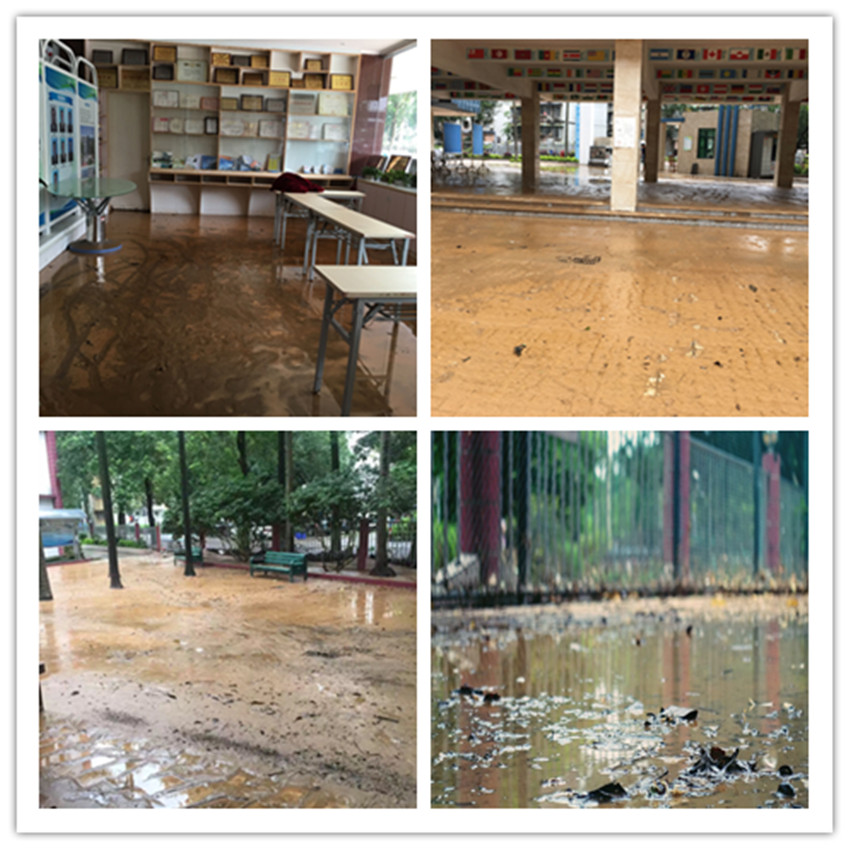 本网讯 受强雷雨云团影响,6月3日18时至22时白云区出现局部大暴雨,并伴有6-8级阵风和强雷电。地处白云山下的广外附属中小学几乎被雨水、泥沙覆盖,成了水浸“重灾区”。晚上11点多,吴玉爱校长通过微信圈通知中层干部第二天八点到校做好清理工作,确保周一学校工作正常进行。