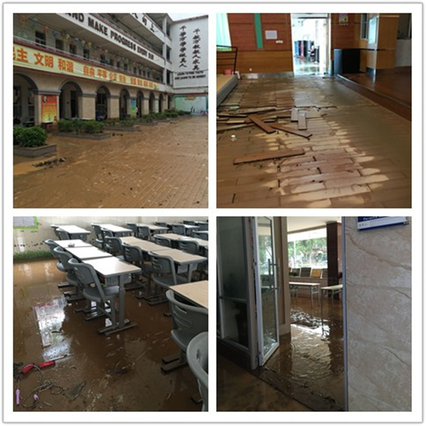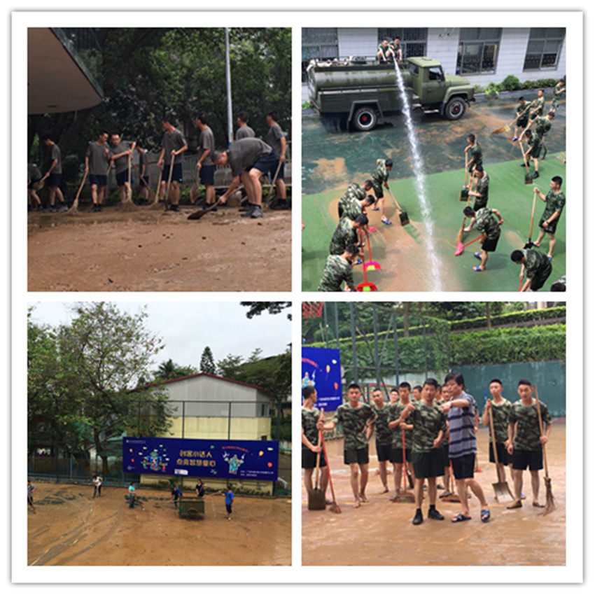 早上8时,学校中层干部快速赶回学校,暴雨过后的学校淤泥堆积,礼堂、尚行楼一楼、明德楼一楼、荟萃楼一楼等全部被水淹没,大家撸起袖子加油干。由于受灾比较严重,为了让学校尽快恢复秩序,确保学生能正常开课,学校不得不向驻守在学校附近的武警广东总队某支队、空军某通讯旅请求支援。
