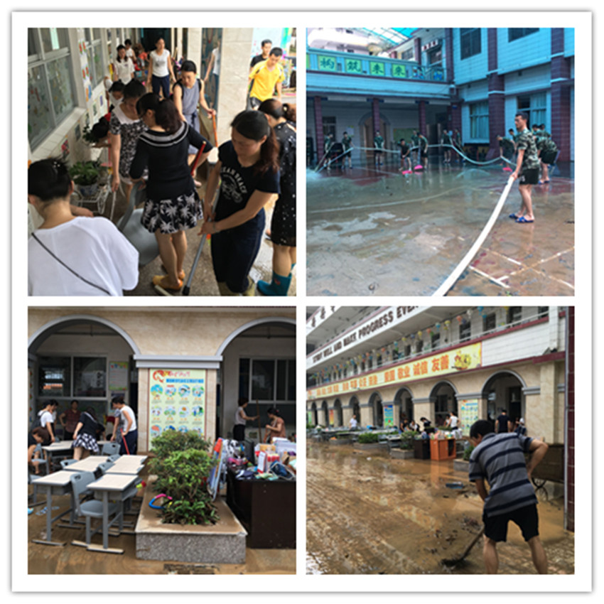 9时多,空军某通讯旅迅速派出官兵携带1台水炮车前来支援;10多分钟后,在营区同样受暴雨影响下的武警广东总队某支队,迅速派出官兵并携带1台大型水炮车也前来支援;嘉雄物业公司的部分员工、一年级部分家长也前后到达学校,一起清淤排污。经过4个多小时的奋战,终于将校园清洗得干干净净。