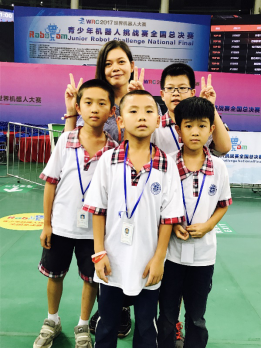 2017世界机器人大赛RoboCom青少年挑战赛全国总决赛由工信部中国工信出版传媒集团与中国电子学会共同主办。优胜选手将有机会与来自全球10多个国家和地区的选手进行最后的决战。广外附小两支战队分别是由滕子钦、周朗乐、张华兴和宋愷组成的Victory战队,和由孙和之、霍子安、刘子正和胡泽枫组成表的尖刀战队。