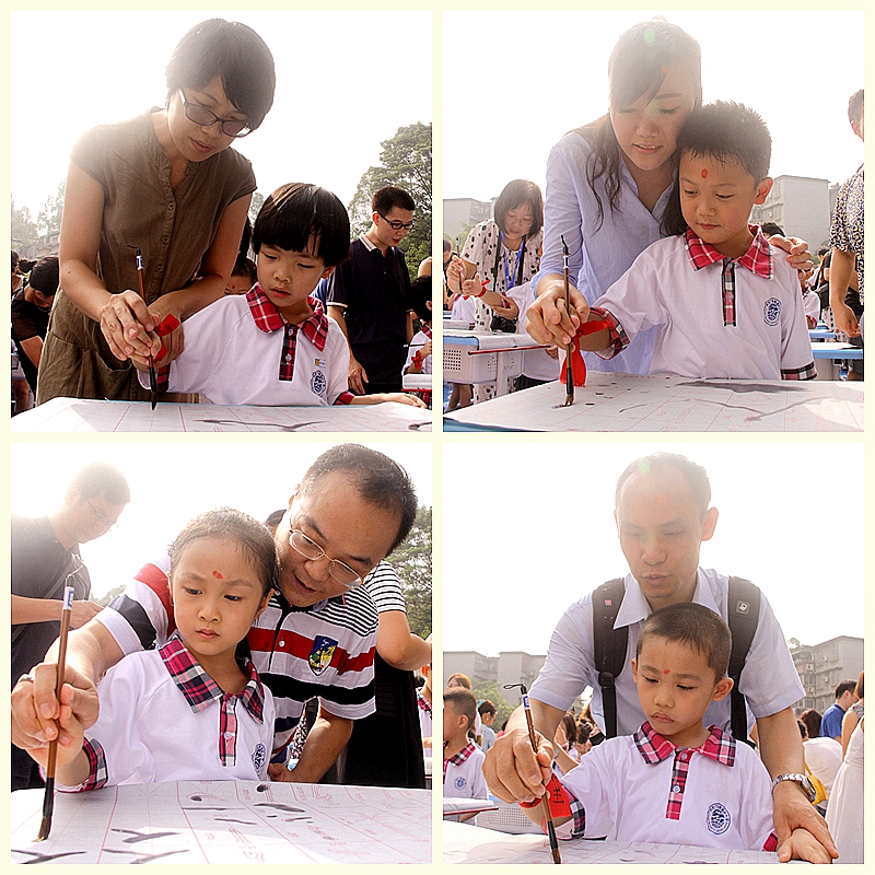 家长们握着孩子们的小手指导他们写下人生第一个“人”
